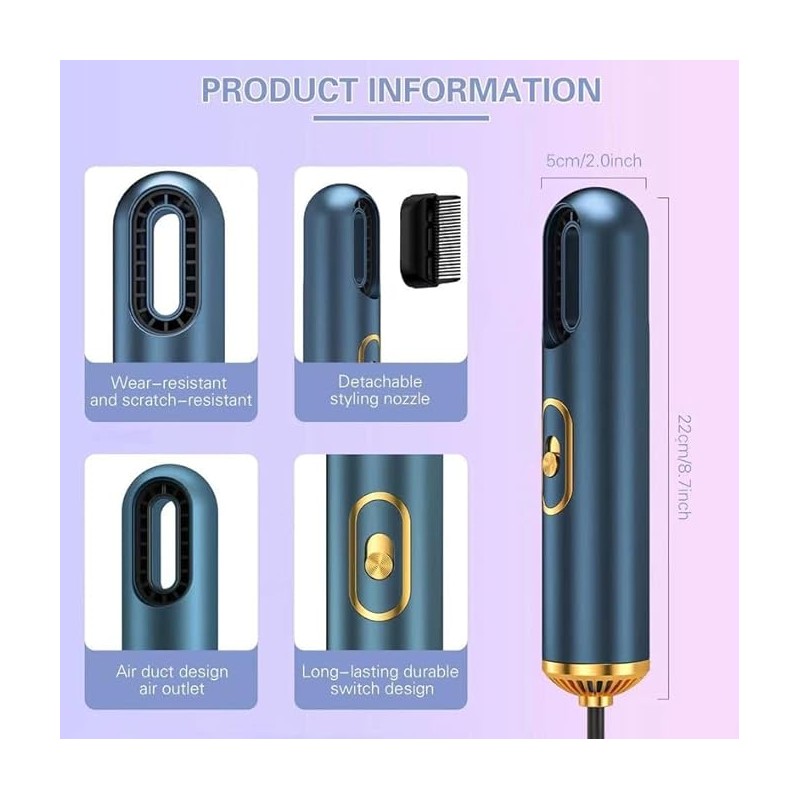 نقدم لكم أداة تصفيف الشعر المبتكرة لدينا، الحل المثالي لتحقيق نتائج بجودة صالون التجميل في المنزل. يجمع هذا الجهاز المتعدد الاستخدامات بين قوة مجفف الشعر ومكثف الحجم، مما يجعله إضافة أساسية إلى روتين جمالك. الجسم المذهل باللون الأزرق الزاهي مع لمسات أنيقة من الذهب لا يبدو أنيقًا فحسب، بل مصمم أيضًا لتحقيق أداء مثالي. يضمن شكله الأسطواني المريح سهولة التعامل، مما يتيح لك تصفيف شعرك بسهولة بيد واحدة. يتميز الفوهة الممتدة بشبكات سحب الهواء الموضوعة بشكل استراتيجي التي تعزز تدفق الهواء، مما يوفر قدرات تجفيف وتصفيف فعالة. تم تصنيع أداة تصفيف الشعر هذه من بلاستيك متين ومقاوم للحرارة، مما يضمن طول العمر مع الحفاظ على خفة الوزن لسهولة الاستخدام. تأتي مزودة بثلاث ملحقات فريدة: مشط للتسريح، وفرشاة دائرية لإضافة الحجم، وفوهة دقيقة للتصفيف المستهدف. تم تصميم كل ملحق لتلبية احتياجات أنواع الشعر المختلفة والأساليب، مما يوفر لك المرونة التي تحتاجها في روتين العناية اليومية. تجعل عناصر التحكم سهلة الاستخدام هذا الجهاز متاحًا للجميع؛ ما عليك سوى الضغط على الزر الدائري البارز للتبديل بين إعدادات الحرارة المتعددة المصممة حسب تفضيلاتك. سواء كنت تبحث عن تجفيف سريع أو خيارات تصفيف معقدة، فإن هذه الأداة تلبي احتياجاتك. أداة تصفيف الشعر هذه مثالية لأولئك الذين يقدرون الكفاءة دون المساومة على الأناقة. يكمل تصميمها العصري أي جمالية للحمام بينما تقدم نتائج استثنائية في كل مرة تستخدمها. حول تجربة تصفيف شعرك اليوم مع هذا الجهاز متعدد الوظائف الذي يعد بالراحة والأناقة!