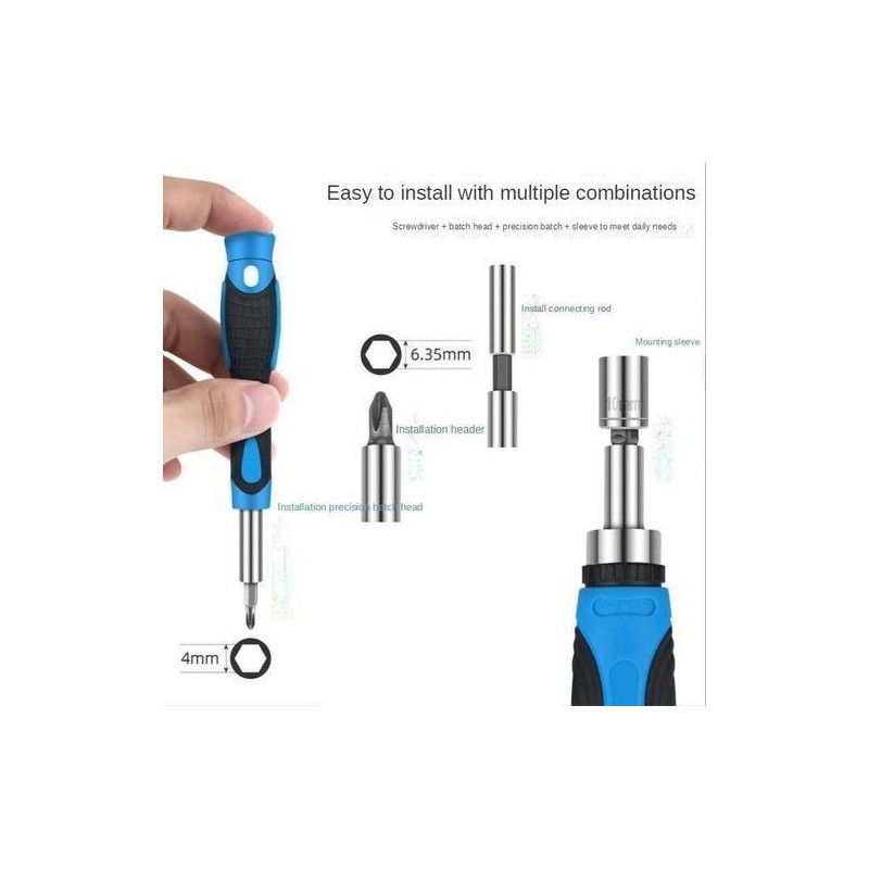 اكتشف الحل النهائي لمشاريعك اليدوية مع مجموعة مفكات متعددة الوظائف لدينا. مصممة لتكون متعددة الاستخدامات وسهلة الاستخدام، هذه الأداة ضرورية في كل منزل. يتميز المقبض بتصميم مريح يجمع بين الأزرق والأسود، مما يوفر جاذبية جمالية بالإضافة إلى قبضة مريحة بفضل تشطيبه الملمس. يرتبط العمود الطويل والنحيف بسلاسة مع رؤوس قابلة للتبديل، مما يتيح لك التعامل مع أنواع مختلفة من البراغي بسهولة. مع أحجام مثل Hex 6.35 mm (1/4 inch) وحجم الرأس الدقيق 4 mm، تعتبر مجموعة المفكات هذه مثالية لكل من المستخدمين العاديين والمحترفين على حد سواء. تم تصنيع مقبض هذا المفك من بلاستيك متين أو مادة مطاطية، مما يضمن تحمله للاستخدام الطويل مع الحفاظ على الراحة أثناء الاستخدام الممتد. يضمن العمود والرؤوس المصنوعة من الفولاذ المقاوم للصدأ القوة ومقاومة التآكل، مما يجعلها خيارًا موثوقًا لأي مهمة. الميزة البارزة لهذه الأداة هي مجموعة رؤوسها القابلة للتبديل، بما في ذلك خيارات شائعة مثل رؤوس فيليبس والمسطحة. تجعل هذه القابلية للتكيف مثالية لتجميع الأثاث أو إجراء إصلاحات إلكترونية بدقة. تسمح لك القضيب الموصل المرفق بتمديد المفك حسب الحاجة، مما يعزز من وظيفته عبر تطبيقات متنوعة. سواء كنت من عشاق الأعمال اليدوية أو تحتاج إلى أدوات بمستوى احترافي في متناول يدك، فإن مجموعة المفكات متعددة الوظائف لدينا تلبي جميع احتياجاتك. أضف هذه الأداة الأساسية إلى مجموعتك اليوم! يضمن تصميمها المدمج سهولة التخزين بينما تكون متاحة دائمًا عندما تحتاجها أكثر. اختبر الراحة والكفاءة مع مجموعة المفكات المتعددة الوظائف لدينا—الحل الأمثل لجميع مهام القيادة بالبراغي!
