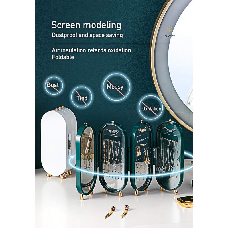 صندوق مجوهرات مع مرآة، قلادة شاشة قابلة للطي بأربعة أبواب