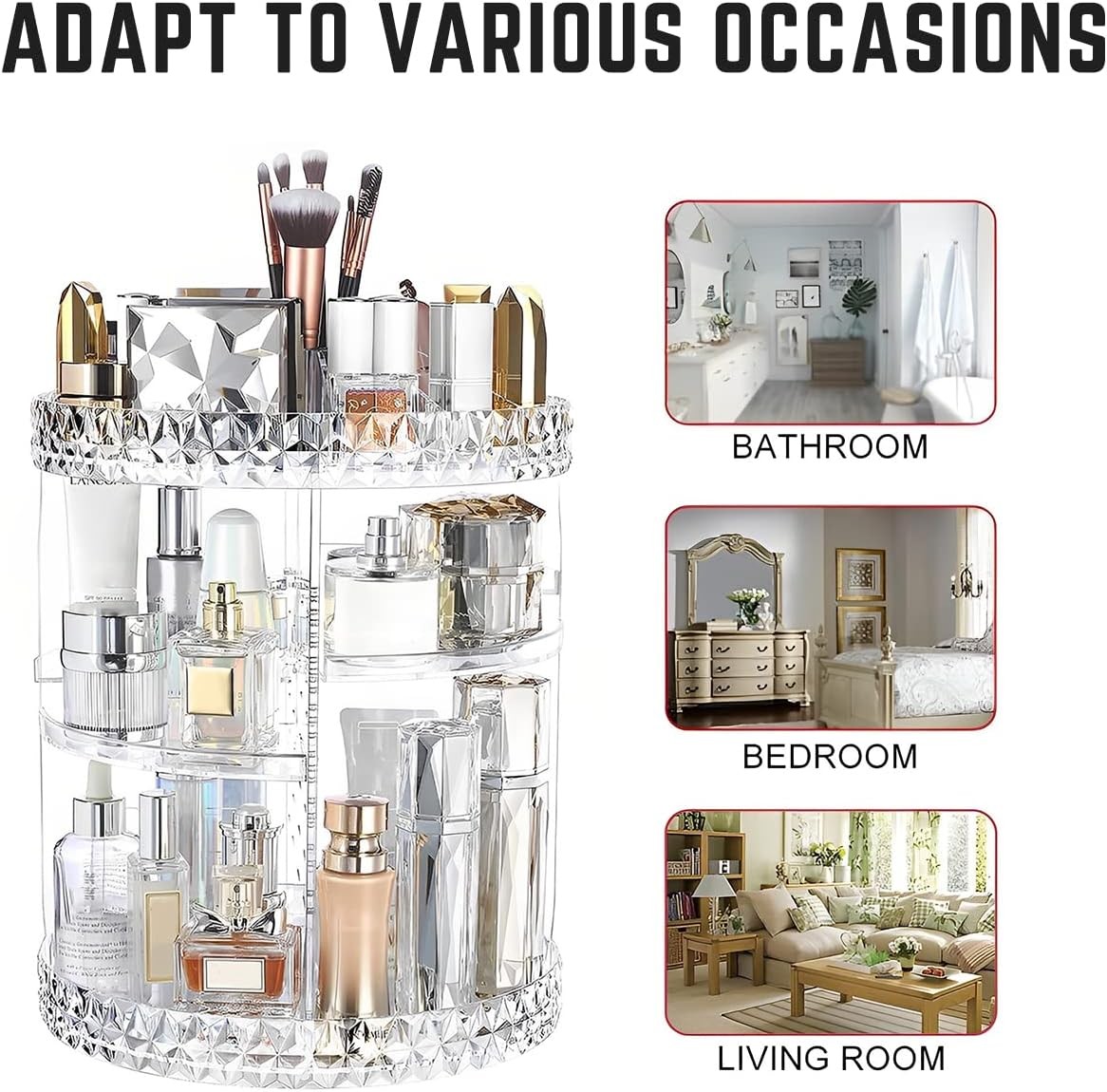 اكتشف منظم الجمال الدوار بزاوية 360 درجة، 3 مستويات للتخزين للمكياج مع حامل دوار لمستحضرات التجميل، مثالي. هذا التخزين الأنيق يزيد من مساحتك بينما يوفر وصولاً سهلاً إلى منتجات جمالك. مصنوع من الأكريليك الشفاف ومصمم ليتناسب مع جميع الأنماط، فهو مثالي لأي حمام أو منضدة تجميل.