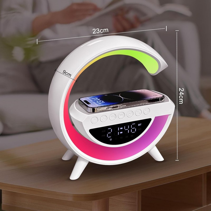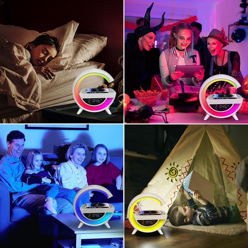 Discover the Lampe de nuit LED avec fonction de chargement, Atmosphere Lamp 15W Wireless Charger LED Table Lamp With Bluetooth Speaker Music. This multifunctional lamp combines ambient lighting with a wireless charger and Bluetooth speaker, perfect for enhancing your space. Enjoy vibrant colors, easy controls, and a sleek design that fits seamlessly into any room while keeping your devices powered.