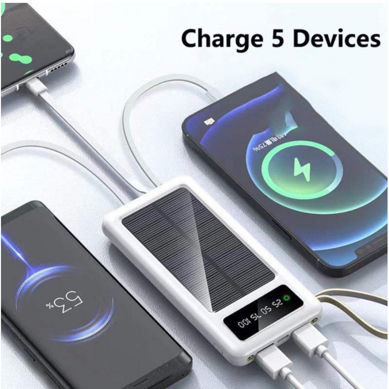 Introducing our latest portable solar power bank, the ultimate solution for charging multiple devices on the go. Designed with a sleek and modern aesthetic, this power bank is perfect for tech enthusiasts who value both functionality and style. The compact rectangular shape makes it easy to carry, fitting seamlessly into your backpack or purse. Crafted from durable plastic, it can withstand light impacts, ensuring longevity during outdoor adventures. The glossy white finish not only enhances its visual appeal but also reflects its eco-friendly capabilities. A standout feature of this device is the integrated solar panel, allowing you to harness renewable energy while enjoying nature. This innovative design ensures that you stay powered up even in remote locations where traditional power sources are unavailable. The digital display screen provides real-time updates on battery life, so you always know how much charge is left. With multiple USB ports available, you can charge up to five devices simultaneously—perfect for family outings or group travels. This portable solar power bank is not just about convenience; it's about making a positive impact on the environment as well. Ideal for camping trips, hiking excursions, or simply daily use in urban settings, it caters to those who prioritize sustainability without compromising on performance. Experience freedom from conventional charging methods with our versatile solar power bank. Whether you're at a festival or exploring off-the-beaten-path destinations, this device ensures your gadgets remain charged and ready whenever you need them. Make the smart choice today and invest in a reliable charging solution that aligns with your lifestyle!