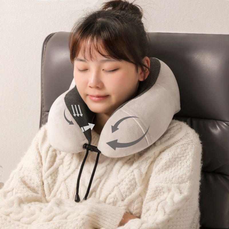Discover the ultimate in relaxation with our U-shaped neck pillow, designed specifically for comfort and support. This innovative pillow features a plush, velvety exterior that feels incredibly soft against your skin, making it perfect for long journeys or cozy evenings at home. The neutral color palette of beige or cream adds a touch of elegance to your space, while the contrasting textured black inner lining enhances its aesthetic appeal. Engineered to cradle your neck gently, this pillow provides essential cushioning on both sides, ensuring you can unwind without strain. One standout feature is the adjustable drawstring mechanism located at the front. This allows you to customize the tightness for a secure fit around your neck, promoting prolonged comfort whether you're traveling by plane or simply relaxing on your couch. Say goodbye to discomfort and hello to blissful rest! This versatile neck pillow also includes directional arrows printed on its surface, hinting at potential massage or heating functionalities that further enhance relaxation. Imagine sinking into soothing warmth as you drift off into peaceful slumber. Sized generously to accommodate adults comfortably, this wellness accessory is not just practical but also stylish enough for any environment—be it home, office, or travel. It’s an ideal solution for anyone looking to alleviate neck pain and improve their overall resting experience. Add our U-shaped neck pillow to your collection of welcome accessories, and transform how you relax today! Experience the perfect blend of functionality and aesthetics that makes every moment more enjoyable.