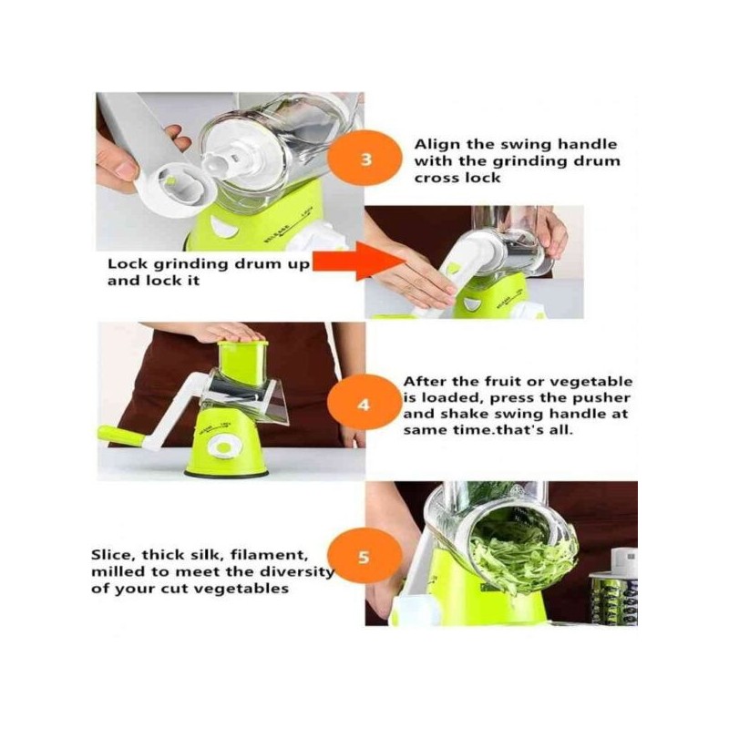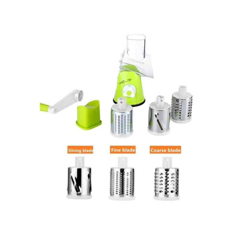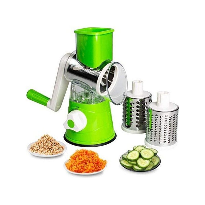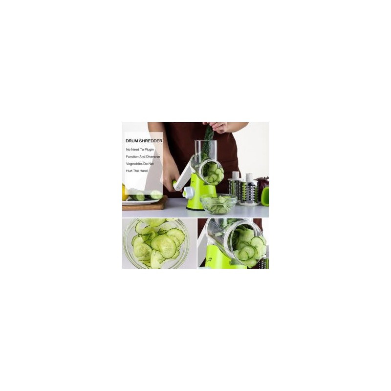 Discover the ultimate kitchen companion with our Râpe à tambour de table, a must-have tool for every culinary enthusiast. This versatile appliance is designed to simplify your food preparation, allowing you to grate and slice a variety of ingredients effortlessly. The Râpe à tambour de table features a vibrant green body made from durable plastic, paired with high-quality stainless steel grating drums. This combination not only ensures longevity but also makes it lightweight and easy to handle. Its compact cylindrical shape provides an ergonomic grip, making it perfect for tabletop use. This innovative grater comes equipped with multiple interchangeable drum attachments, each tailored for different tasks. Whether you need fine shavings for cheese or larger slices for vegetables like carrots and cucumbers, this tool has got you covered. The convenient feeding tube allows you to insert food items easily while the adjustable settings let you customize your grating size according to your needs. A standout feature of the Râpe à tambour de table is its secure suction base that keeps it firmly in place on smooth surfaces during operation. This stability ensures safety and efficiency as you prepare meals quickly and effectively. This kitchen essential is perfect not just for grating vegetables but also for nuts and other ingredients, making it ideal for salads, garnishes, or cooking preparations. Embrace the ease of manual operation combined with practical design in your culinary adventures. Add the Râpe à tambour de table to your collection today and elevate your cooking experience with this indispensable kitchen gadget!