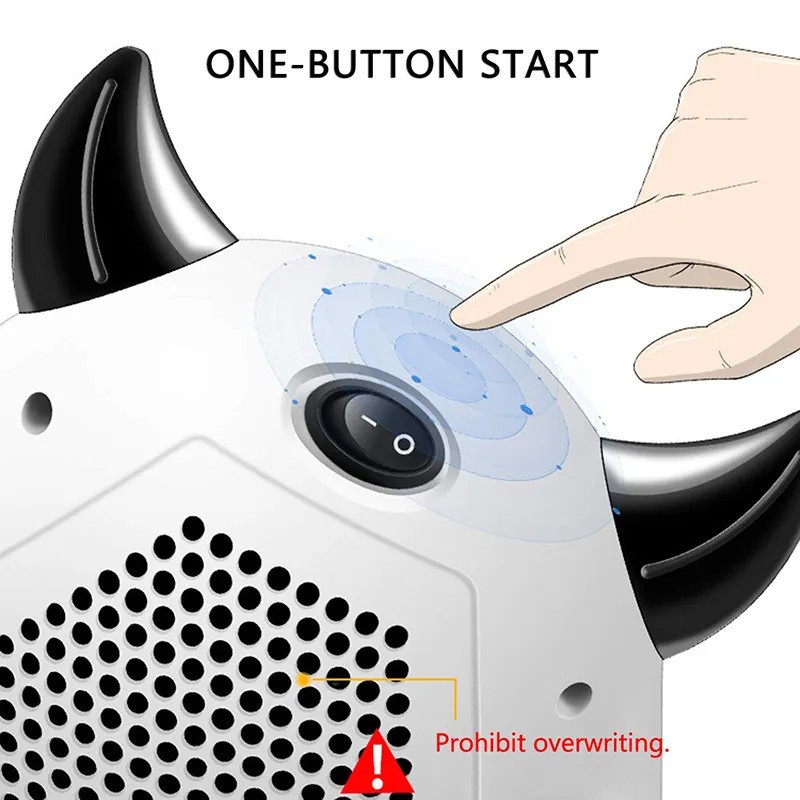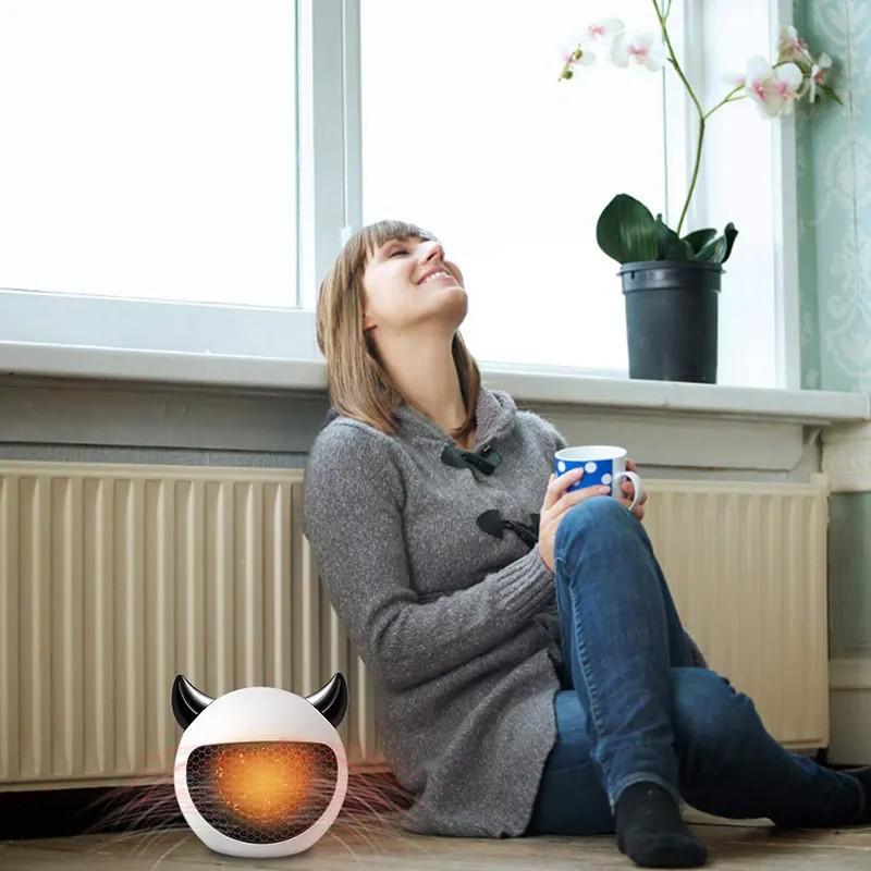 Discover the Little Devil Electric Heater for Home Fan, Portable Foot Warmer, the ideal ally for your chilly days. With its compact and playful design, this heater stands out with its rounded shape and adorable black horns that add a touch of whimsy to your interior. Made primarily of durable plastic, this lightweight device is easy to carry from room to room. Whether you want to warm your feet under your desk or bring a bit of heat to a small bedroom, the Little Devil Electric Heater perfectly adapts to all your needs. The heating element emits a soft orange light when the device is in operation, creating a warm atmosphere while ensuring optimal comfort. Thanks to its integrated thermostat system, you can easily adjust the temperature to your preferences. This device is not limited to heating; it also functions as a fan, providing a versatile solution for all seasons. Its honeycomb-patterned grille allows for efficient airflow while ensuring safety during use. With features such as automatic shut-off, you can use the heater with peace of mind. Perfect for bathrooms or small spaces, this model combines aesthetics and practicality. Don't wait any longer to add comfort to your daily life with the Little Devil Electric Heater for Home Fan, Portable Foot Warmer. Transform every chilly corner of your home into a warm and welcoming haven!