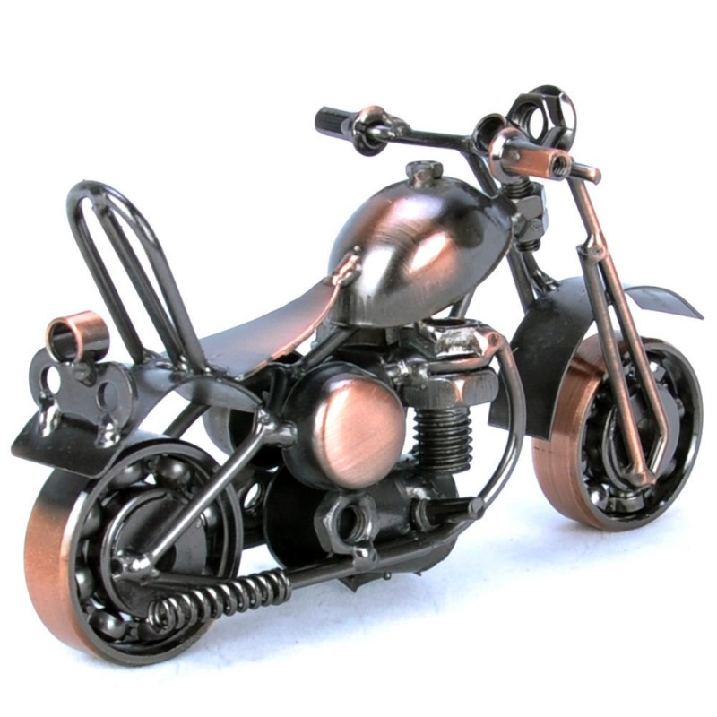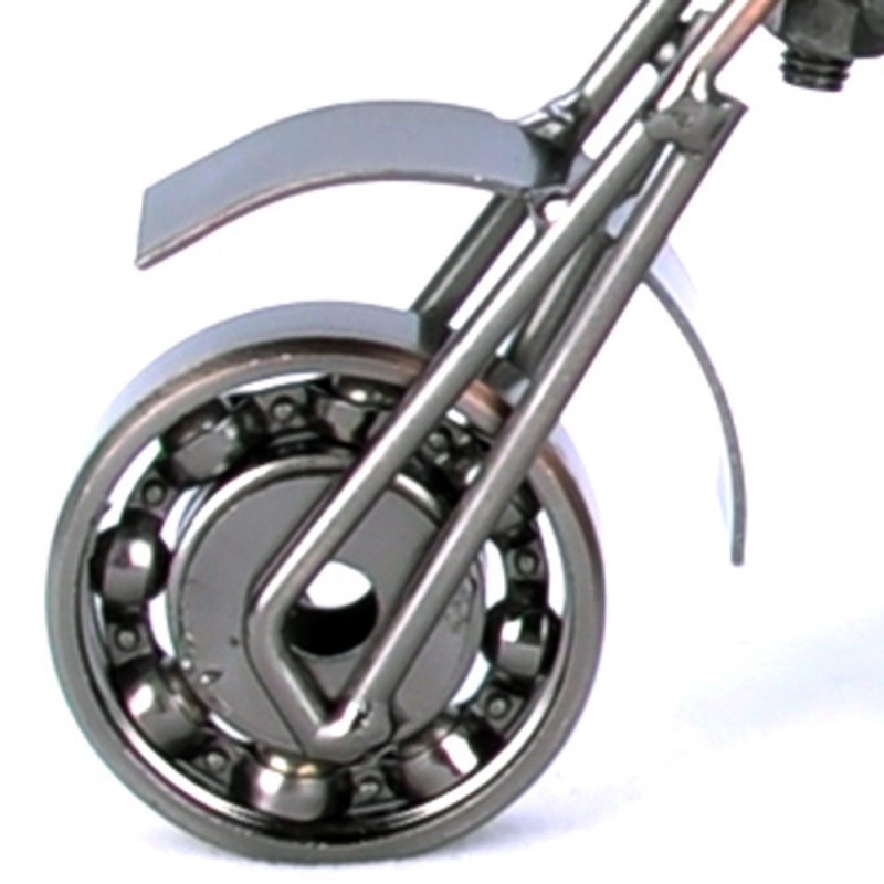 Discover the exquisite craftsmanship of the Moto Miniature Originale en Fer Forgé Soudée à la Main, a stunning representation of classic motorcycle design. This hand-welded wrought iron miniature motorcycle is not just a decorative item; it’s a celebration of vintage aesthetics and artisanal skill. With its elegant chopper design, this miniature features an elongated frame that captures the essence of iconic motorcycles. The polished metallic finish, primarily in silver with varying shades of gray, highlights its intricate details and robust construction. Measuring typically between 6 to 12 inches in length, it fits perfectly on shelves or desks, making it an ideal addition to any collection. Crafted entirely from durable wrought iron, this piece showcases visible hand-welded joints that enhance its artisanal quality. The smooth surface texture combined with brushed elements adds depth and visual interest. Notable components include a beautifully designed front fork supporting dual-shielded fenders and an engine section that intricately represents motorcycle mechanics with visible springs. The slightly raised seat with backrest suggests comfort while maintaining style, while both front and rear wheels feature distinct spokes for an authentic look reminiscent of classic motorcycles. This attention to detail makes the Moto Miniature Originale en Fer Forgé Soudée à la Main not only a decorative piece but also a thoughtful gift for motorcycle enthusiasts or collectors alike. Embrace the spirit of classic motorcycles in your home or office with this unique handcrafted miniature. Whether you’re looking to enhance your decor or searching for the perfect gift, this striking piece is sure to impress anyone who appreciates fine craftsmanship and vintage style.