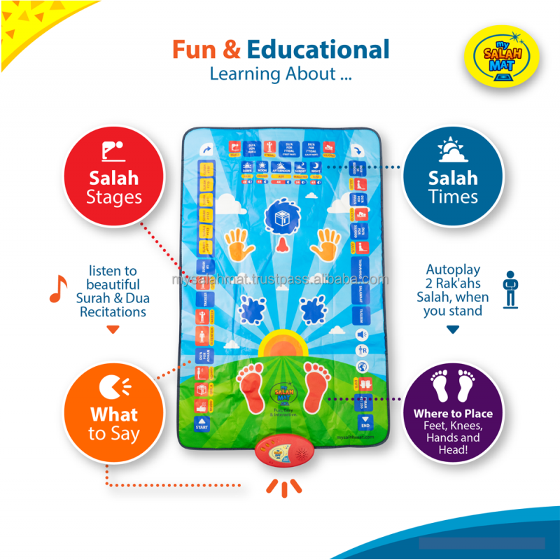 Discover the Smart Interactive Electronic Prayer Rug for Kids, a revolutionary educational tool that transforms learning about prayer into a fun and engaging experience. Designed for children aged 3 and up, this innovative rug makes understanding religious practices easier while making learning enjoyable. With dimensions of approximately 24 inches x 39 inches, the rug provides ample space for children to engage in their prayer activities. Made from durable fabric with a non-slip backing, it is designed to withstand daily use while being easy to clean. The Smart Interactive Electronic Prayer Rug stands out with its exceptional features. It includes 36 touch-sensitive keys, allowing children to interact directly with the rug. When they stand on certain areas, sounds and verbal instructions are emitted, creating an immersive learning environment. This tool covers various essential aspects of Salah, such as Wudu (ablution), Adhan (call to prayer), as well as the appropriate positions and times for prayer. With multilingual support in over 15 languages, including Arabic and English, it is accessible to everyone. To enhance this educational experience, each purchase also includes a free activity book featuring 20 engaging pages and a user manual for parents. This Prayer Rug is not only a valuable resource for teaching religious values from a young age but also a unique way to integrate technology into children's spiritual education. Don't wait any longer! Give your child this essential tool that combines religious learning with fun!