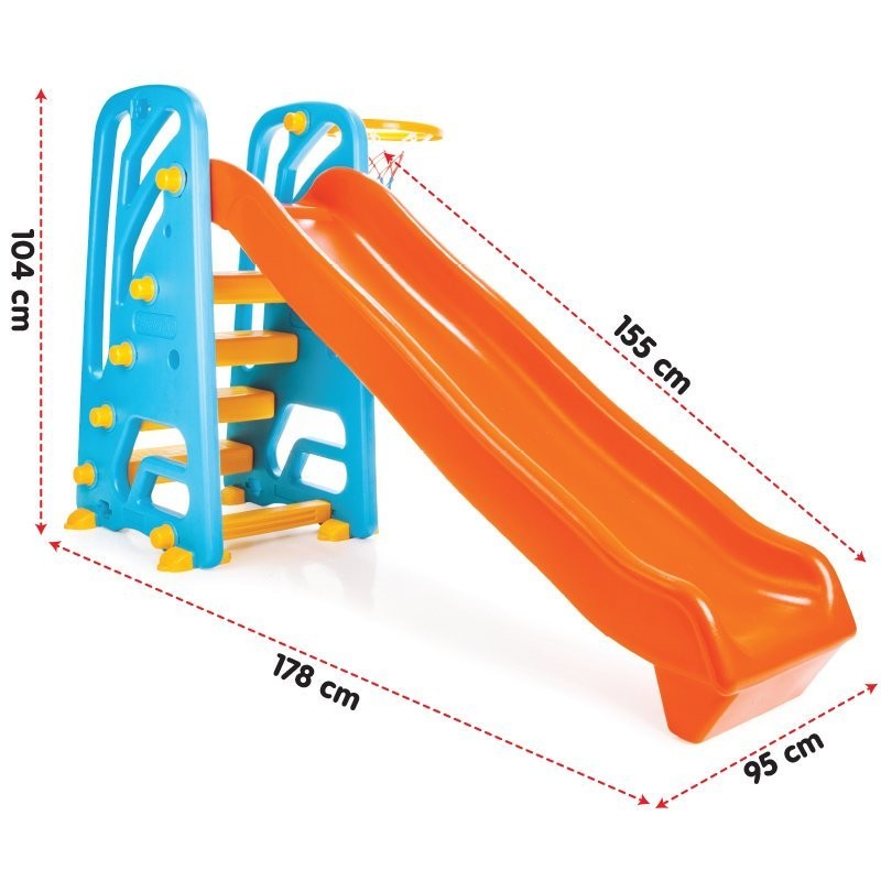 The description: A mini complex game that includes a slide and a basketball hoop. Made of high quality environmentally friendly plastic with the highest safety standards, to withstand changes in outdoor climate. New Design Slide.Fun and Safe.Easy installation.Basketball hoop.Possibility of using in indoor and outdoor spaces.Robust and aesthetic design.Made of materials suitable for children's health.Raw material that does not contain pathogenic substances and is suitable for Features: Gender Unisex Dimensions 172 x 91 x 102 cm Charge capacity35 kg Age 03 years +Color Multicolors