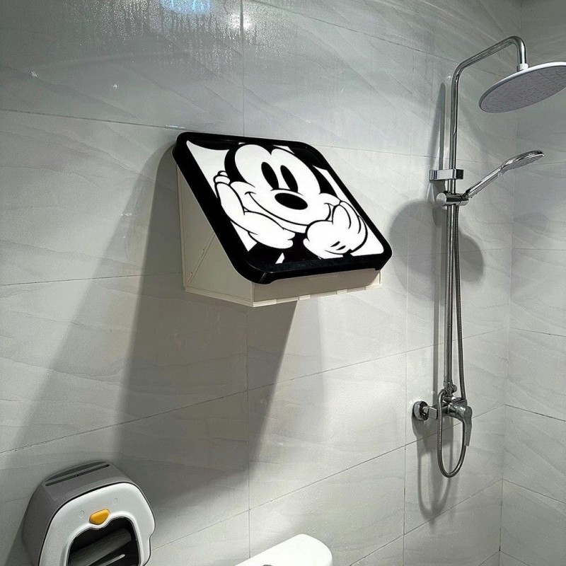 Introducing our stylish and functional w wall-mounted storage unit, the perfect addition to your home, especially in bathrooms or laundry spaces. This innovative piece combines practicality with a modern aesthetic, making it an essential organizational tool. The unit features a sleek design that incorporates both decorative and functional elements. The top surface showcases a playful graphic of a cartoon character, adding a whimsical touch to your decor. The color scheme, primarily in black and white, is complemented by soft pastel tones visible in the folded towels beneath, creating an inviting atmosphere. Crafted from durable plastic or composite materials, this storage unit ensures longevity while remaining easy to clean. Its compact size allows for effortless wall mounting without consuming valuable floor space. The rectangular shape with a gently sloped top provides easy access to stored items, making organization simple and efficient. The hinged design of the storage compartment enhances functionality by allowing quick access to rolled towels or other small essentials. This makes it an ideal solution for keeping your bathroom tidy or enhancing your laundry room's efficiency. This versatile piece not only serves as practical storage but also elevates the style of any room it graces. Whether you're looking to organize toiletries in the bathroom or store supplies in the laundry area, our wall-mounted storage unit fits seamlessly into contemporary decor trends while promoting a casual and inviting vibe. Transform your space today with this unique blend of style and utility—your home deserves nothing less than exceptional organization!