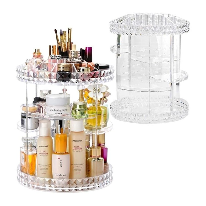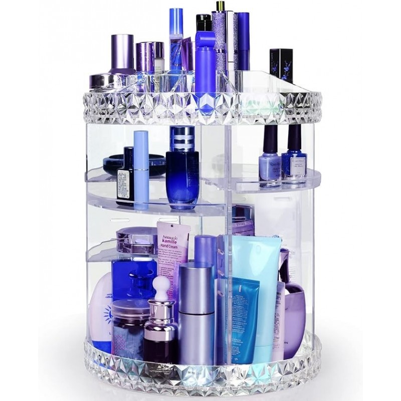 Discover the adjustable 360-degree rotating multifunctional makeup organizer made of acrylic, designed to optimize your beauty space. Made from durable acrylic, it provides easy access to your cosmetics with its rotating mechanism. With its adjustable levels and large capacity, this organizer is perfect for storing makeup, skincare, and accessories.