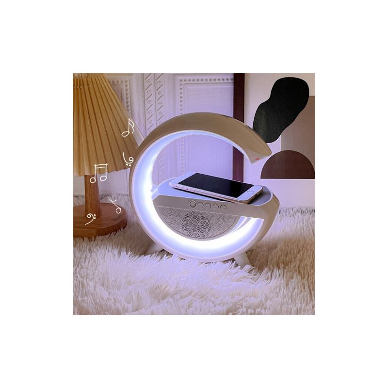 Introducing our modern wireless charging station, a perfect blend of style and functionality for your home or office. Designed with a unique crescent shape, this charging station not only serves its purpose but also enhances the aesthetic of any space.The compact design makes it ideal for placement on your desk or nightstand, ensuring that your devices are always within reach. Crafted from durable plastic with a glossy finish, this charging station exudes a contemporary vibe that appeals to tech enthusiasts and minimalists alike.With its predominantly white color, the wireless charging station maintains a clean and minimalist look. The integrated LED lights create an eye-catching color gradient effect, transitioning smoothly from green to blue and pink, adding an element of dynamism to your environment.This innovative device supports Qi wireless charging technology, allowing you to charge your smartphone effortlessly by simply placing it on the top surface. The control buttons located on the front provide easy access for managing the charging process or adjusting lighting effects according to your mood.Additionally, this dual-purpose device features a mesh design at its lower section that likely houses a speaker, enabling you to enjoy high-quality audio while keeping your phone charged. Whether you're listening to music during work hours or unwinding in the evening, this versatile accessory caters to all needs.The modern design combined with practical features makes our wireless charging station an essential addition for anyone looking to elevate their tech accessories. Experience convenience without compromising style—make this stylish piece part of your daily routine today!