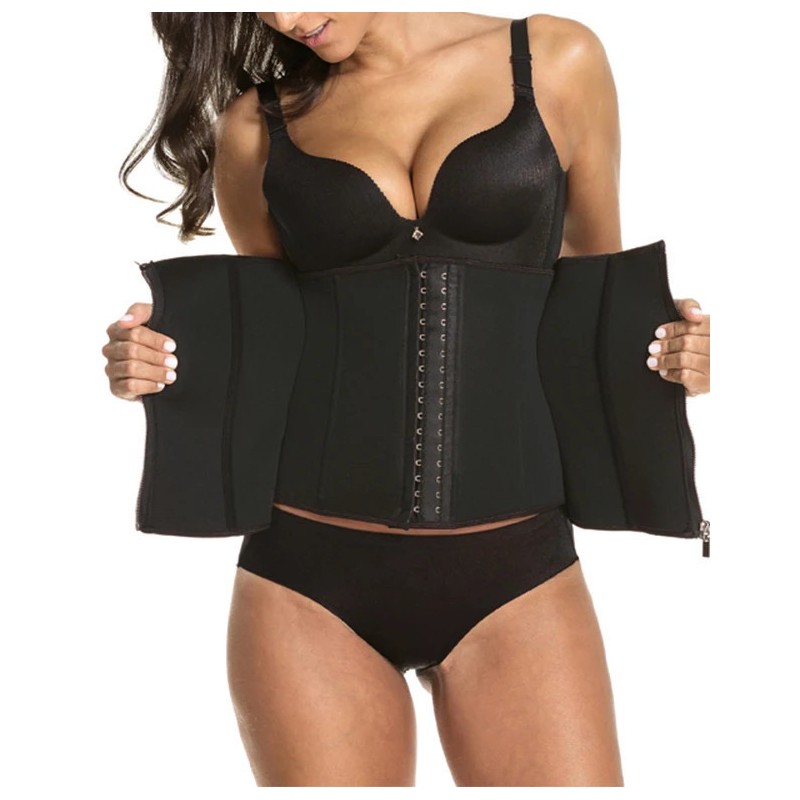 Discover the Gaine Colombienne-Corset d'entraînement à la taille sous le buste en latex, designed for ultimate waist shaping and support. This sleek black corset features adjustable hooks and a zipper closure for a perfect fit. Made from high-quality latex, it enhances your curves while ensuring comfort during workouts or daily wear. Achieve an hourglass silhouette effortlessly!