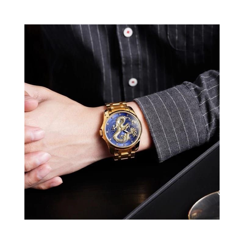 Discover the Skmei watch for men and women, water-resistant, combining style and functionality. With its gold stainless steel case and blue dial adorned with a dragon, this watch is perfect for any occasion. Enjoy its water resistance and practical features while showcasing a unique elegance every day.