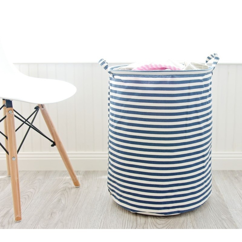 Introducing our versatile round fabric laundry basket, the perfect blend of style and functionality for your home. This medium to large-sized container is designed to accommodate a variety of items, from laundry to toys, making it an essential addition to any room. The basket features a cylindrical shape, allowing for easy storage and access. Crafted from durable fabric, likely a cotton or cotton blend, it offers both flexibility and strength. The soft texture ensures comfort while handling, making it ideal for everyday use. With its eye-catching navy blue and white striped design, this laundry basket adds a modern touch to your decor. The evenly spaced stripes create a striking contrast that enhances its visual appeal, fitting seamlessly into various home settings such as bedrooms, bathrooms, or nurseries. The interior boasts a light-colored lining that protects your belongings while adding an extra layer of style. Two sturdy fabric handles on opposite sides make lifting and transporting the basket effortless. The wide opening provides easy access to all contents inside—no more fumbling around! This round laundry basket is not just practical; it's also incredibly versatile. Use it for organizing toys in the playroom or as an attractive storage solution in living spaces. Its modern aesthetic aligns perfectly with minimalist design principles while maintaining functionality. If you're looking for an efficient way to keep your space tidy without sacrificing style, our round fabric laundry basket is the answer! Embrace organization with this chic storage solution that complements any contemporary home decor.