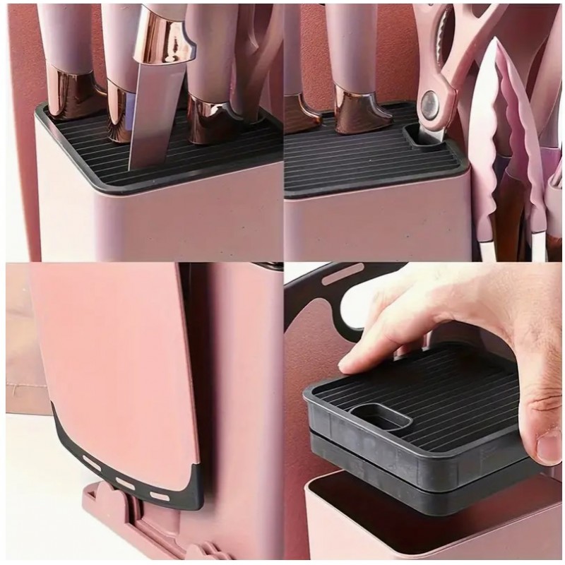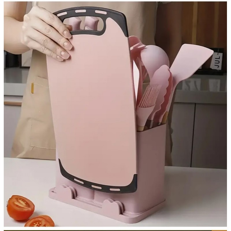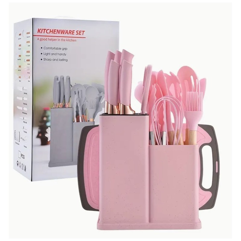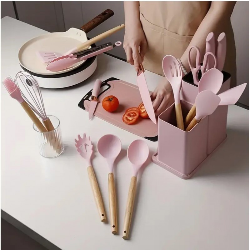 Wooden handle cookware prevents heat transfer during cooking to protect your hands from burns. This kitchen set also includes a stylish organizer container.