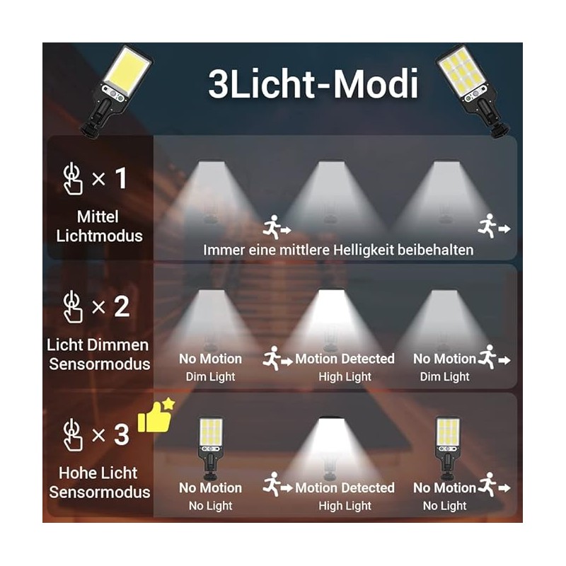 Discover our innovative lighting product featuring three distinct light modes for versatile illumination. Choose from Mittel Lichtmodus for steady brightness, Licht Dimmen Sensor Modus that adapts to motion, or Hohe Licht Sensor Modus, which activates high intensity upon detection. Perfect for outdoor settings and security applications, this energy-efficient solution ensures optimal lighting when you need it most.