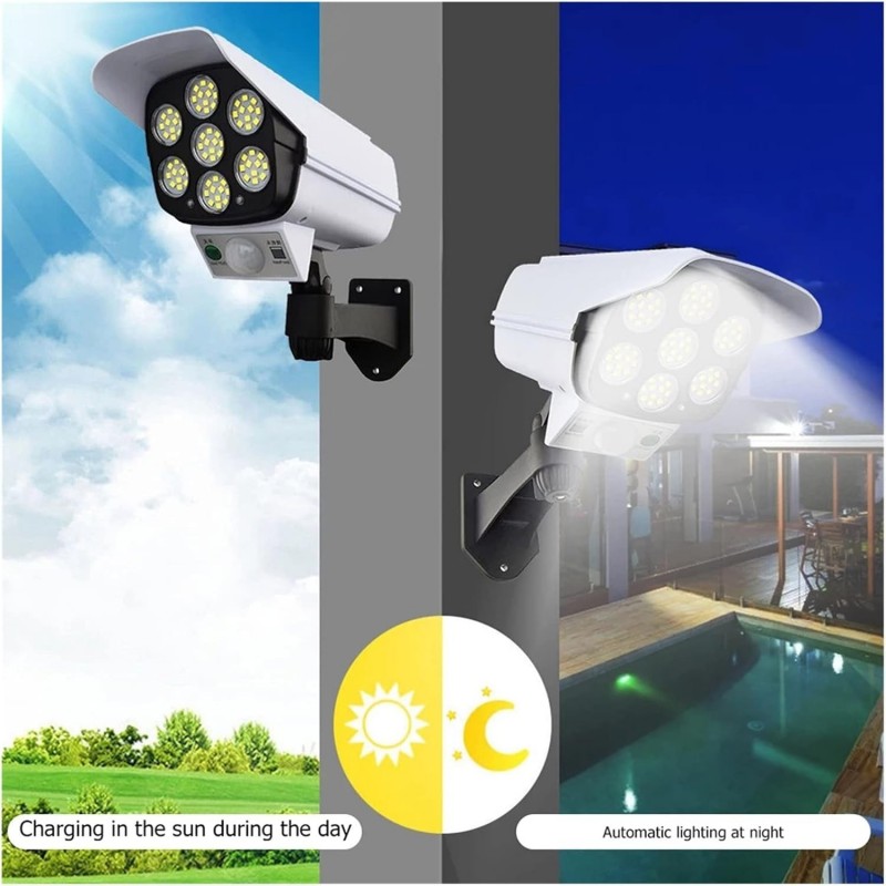 Illuminate your outdoor spaces with our solar-powered LED wall light, perfect for pathways and gardens. Featuring a motion sensor for enhanced security, this durable and waterproof fixture combines modern design with energy efficiency. Enjoy bright illumination while reducing energy costs with the Applique murale solaire appliques murales fausse caméra capteur de corps humain étanche lampe à LED extérieur chemin de jardin.