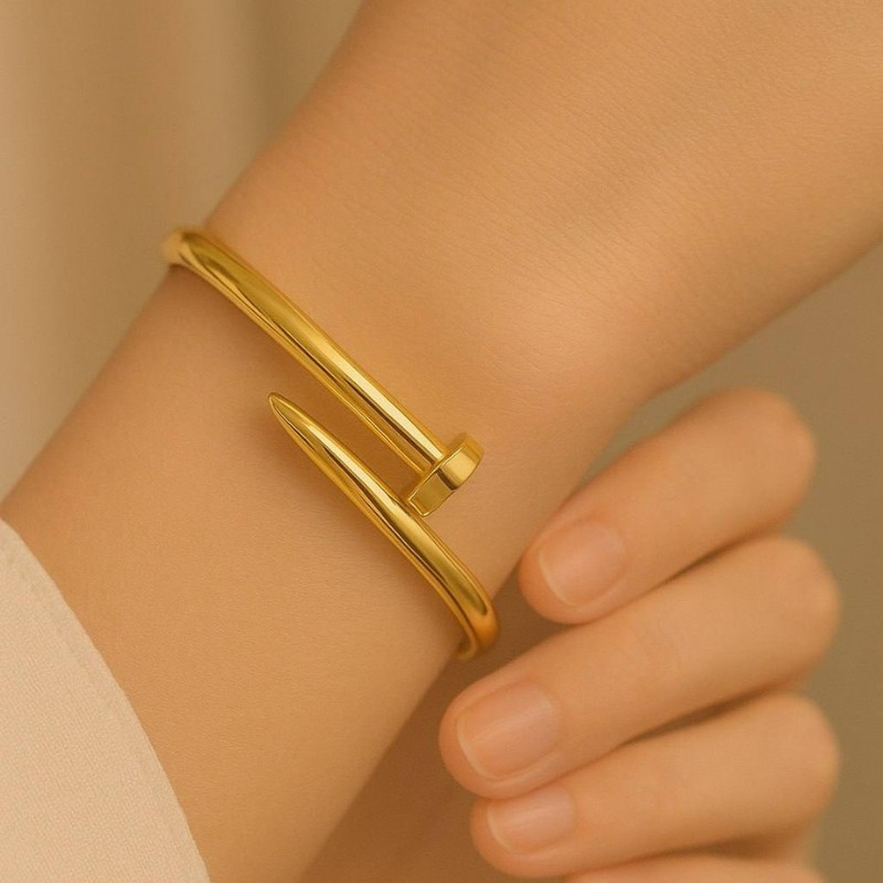 The minimalist design of this bracelet is characterized by its smooth, rounded shape that gracefully wraps around your wrist. With an open cuff structure, it boasts an asymmetrical design where one end tapers to a pointed tip while the other has a small squared-off section. This unique feature not only enhances its modern aesthetic but also makes it suitable for both casual outings and formal events.