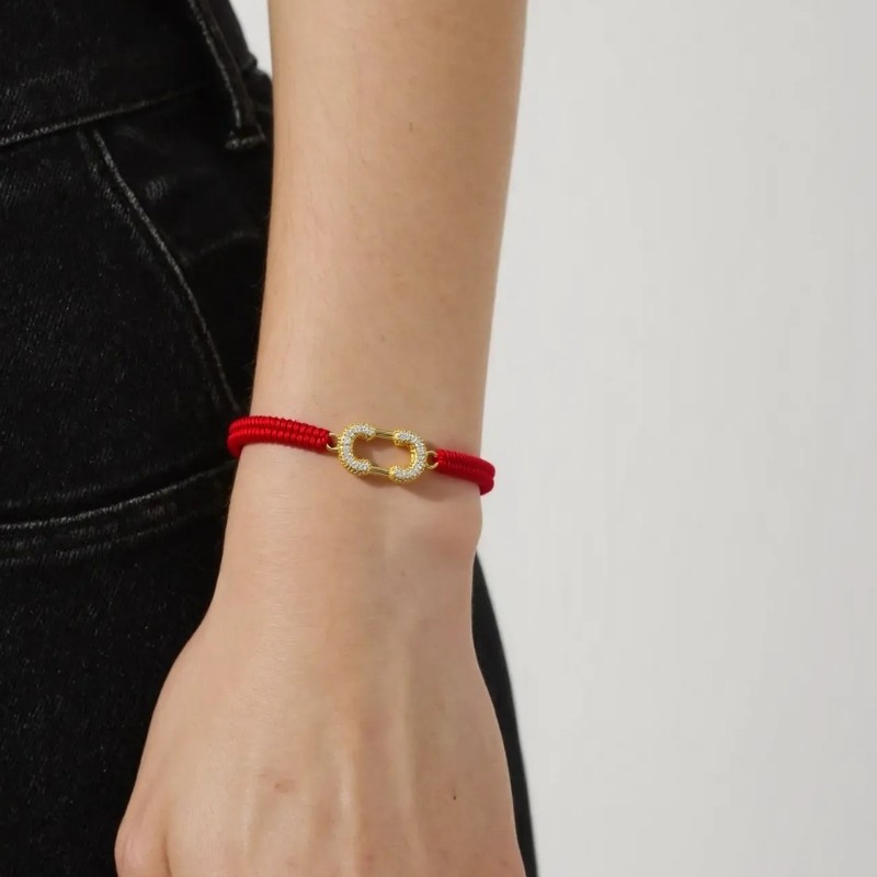 Discover the perfect blend of style and sophistication with our stunning red cord bracelet. This exquisite piece is designed to elevate your accessory game, making it a must-have addition to your jewelry collection. Crafted from a durable fabric or nylon material, the tightly woven cord offers both flexibility and strength, ensuring long-lasting wear. The highlight of this bracelet is its unique metallic closure, shaped like an elongated oval link. Made from high-quality alloy or gold-plated material, it features a polished finish that catches the eye. Adorned with small clear stones or crystals, likely cubic zirconia, this closure sparkles beautifully in the light, adding an elegant touch to any outfit. With its vibrant red color contrasting against the shiny gold of the closure, this bracelet stands out as a statement piece suitable for various occasions. Whether you're dressing up for a special event or looking to enhance your everyday style, this accessory fits seamlessly into any wardrobe. The smooth yet textured surface of the cord provides a comfortable fit around your wrist while allowing for slight adjustability. Its modern design makes it versatile enough to be worn alone or layered with other bracelets for a trendy look. This stylish bracelet is not just an accessory; it's also an ideal gift choice for friends and loved ones who appreciate contemporary fashion. Perfect for birthdays, anniversaries, or just because—this piece embodies simplicity and elegance that appeals to all ages. Add our chic red cord bracelet to your collection today and experience how it effortlessly enhances your personal style!