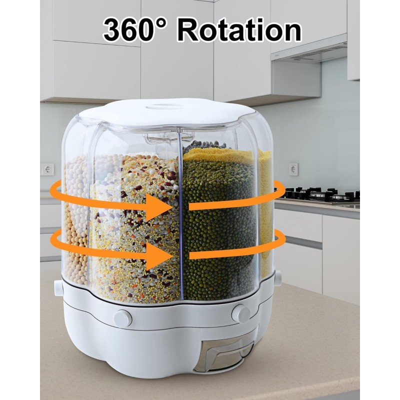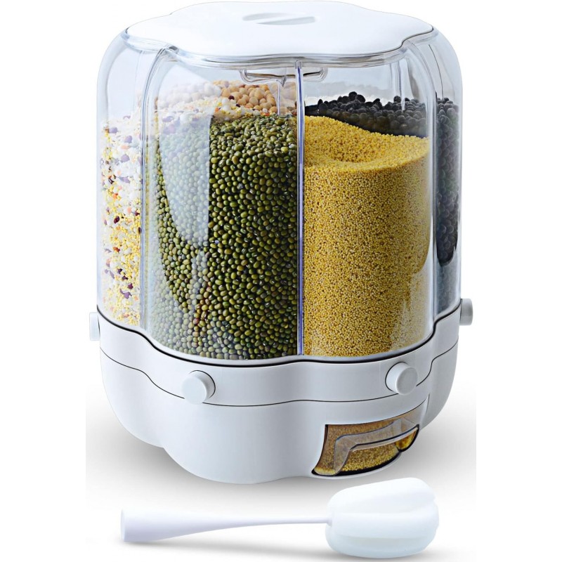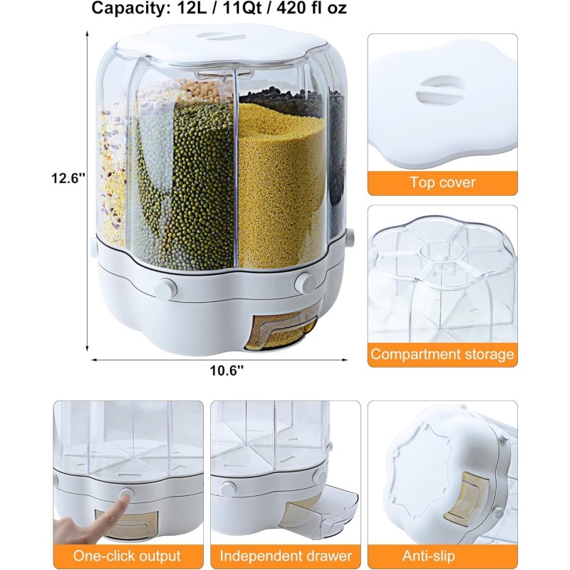 Introducing the Grain Dispenser, 11 Qt Rotating Storage Container, a must-have for any organized kitchen. This innovative storage solution features a unique rotating design with six separate compartments, perfect for keeping your small grains neatly stored and easily accessible. Whether you’re storing rice, beans, or lentils, this dispenser ensures that your dry foods remain fresh and ready to use. The durable construction of this dry food dispenser is made from high-quality transparent plastic, allowing you to quickly see the contents inside each compartment. The sleek white accents not only enhance its modern aesthetic but also make it a stylish addition to any kitchen decor. Its compact size makes it ideal for countertop placement or fitting within standard kitchen cabinetry. This versatile container includes an easy-to-use measuring cup, ensuring precise portioning of your favorite grains while minimizing mess during meal prep. The bottom outlet allows for controlled dispensing of contents with just a simple turn of the rotating mechanism—no more spills or wasted food! The Grain Dispenser is designed with convenience in mind; it caters to home cooks who value efficiency and organization in their kitchens. By streamlining access to essential ingredients, this product enhances cooking experiences and supports effective meal preparation. If you're looking to elevate your kitchen storage solutions while maintaining an organized space, the Grain Dispenser is the perfect choice. Embrace simplicity and style as you keep your dry foods fresh and easily accessible!