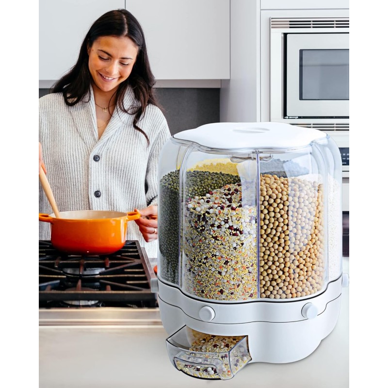 Transform your kitchen organization with the Grain Dispenser, 11 Qt Rotating Storage Container, 6-Compartment Dry Food Dispenser with Measuring Cup for Kitchen Small Grains. This sleek, transparent container features six compartments for easy access to various grains. Its rotating mechanism and included measuring cup ensure precise portion control, making it an essential tool for maintaining a tidy pantry.