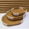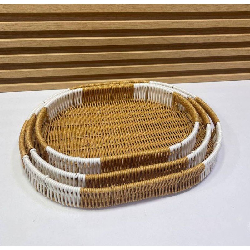 Enhance your home decor with our exquisite set of oval-shaped woven trays. This trio of trays combines functionality and style, making them a perfect addition to any living space. Crafted from natural materials, these trays feature a warm, golden brown hue that exudes an organic charm. The unique nested design allows for easy storage while showcasing the elegant silhouette of each tray. The largest tray forms the base, with two smaller ones perfectly stacked on top. Each tray is made from durable woven material, likely rattan or a similar reed, ensuring longevity and resilience in everyday use. What sets these trays apart is their distinctive handle design. Integrated handles formed by the continuation of the weave make carrying effortless while adding to their aesthetic appeal. The strategic placement of white woven sections around the perimeter creates a striking contrast that enhances their visual interest and adds a modern touch to traditional craftsmanship. The versatility of these trays makes them ideal for various uses. Whether you’re serving snacks at gatherings or displaying decorative items like candles and plants on your coffee table, they are sure to impress guests and elevate your home’s ambiance. Additionally, they serve as excellent organizational tools in kitchens or offices for keeping smaller items neatly arranged. This set reflects a contemporary bohemian style that resonates with those who appreciate natural materials combined with modern aesthetics. Transform your space today with our beautiful oval-shaped woven trays—where practicality meets elegance!