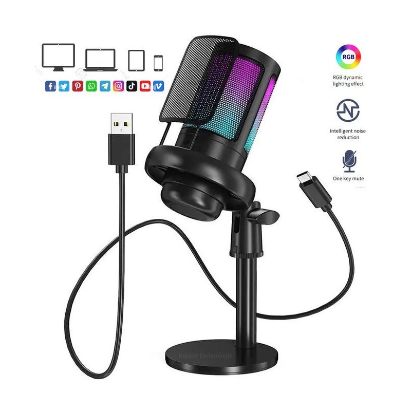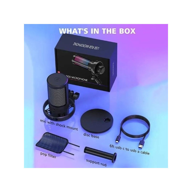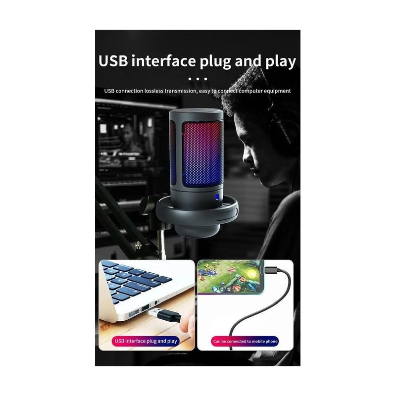 RGB Light Condenser Microphone for PC Computer Recording Streaming Karaoke Singing Studio Professional Mic USB Description:Condenser Microphone: The USB RGB LightCondenser Microphone ensures high-quality sound recording, making it perfect for professional use.• Cardioid Polar Patterns: Cardioid polar patterns pick up sound from the front of the microphone, reducing background noise and improving audio quality. • Tabletop Style: Tabletop style makes it easy to place the microphone wherever you want, giving you more flexibility while recording or streaming. • Single Microphone Set: The single microphone set is perfect for those who need a high-quality microphone without the need for multiple microphones. • S-Mall Diaphragm: The S-Mall diaphragm design ensures accurate sound capture, making it ideal for professional use.About this item • Dynamic RGB Lighting Effects: Immerse yourself in a stunning visual experience with dynamic RGB lighting effects that enhance your recording or streaming setup. • Smooth and Clear Sound: Enjoy exceptional audio quality with smooth and clear sound reproduction, allowing you to capture every detail precisely. • Intuitive Mic Control: Easily control microphone settings with intuitive controls, allowing you to adjust volume levels and activate voice enhancements effortlessly. •Noise Reduction Accessories: Included noise reduction accessories help minimize unwanted background noise, ensuring clean, professional-quality recordings. • Plug and Play: Enjoy hassle-free setup with plug and play functionality, allowing you to start recording, streaming, performing or singing immediately without complicated setup. Enhance your audio setup with the RGB light condenser microphone and unleash your creativity in recording, streaming, gaming, karaoke and studio work. With its high-quality sound recording, versatile features and captivating RGB lighting effects this microphone is the perfect choice for professionals and enthusiasts. Improve your audio experience today.