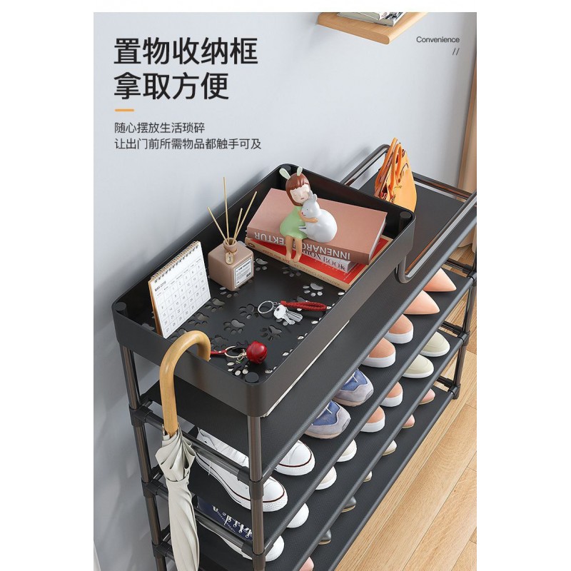 Introducing our innovative multi-functional shoe rack, designed to elevate your home organization while adding a touch of modern elegance. This stylish piece is perfect for any entryway, mudroom, or bedroom, combining practicality with aesthetic appeal. The shoe rack features a sturdy metal frame finished in a sleek matte black color, ensuring both durability and stability. With four spacious horizontal shelves, it provides ample space to store multiple pairs of shoes. The bottom shelf is specifically designed for taller footwear like heels, while the upper shelves are ideal for sneakers and casual shoes. Measuring at a moderate height, this shoe rack allows easy access to all your favorite footwear without the need for excessive bending or stretching. Its thoughtful dimensions ensure that it fits seamlessly into various spaces without overcrowding your room. The smooth finish of the metal frame not only enhances its visual appeal but also ensures safety with rounded edges that prevent sharp corners. Each shelf is crafted from durable materials that are easy to clean and maintain. A distinctive feature of this shoe rack is its top shelf storage area—a shallow tray perfect for holding smaller items such as keys or decorative pieces. To add personalization, we’ve included a charming decorative box adorned with a bunny pattern on the top shelf. Additionally, vertical supports on the sides enhance stability and offer convenient hanging options for items like umbrellas. This versatile shoe organizer serves dual purposes: keeping your footwear neatly arranged while enhancing your home’s decor. Invest in our multi-functional shoe rack today and transform your space into an organized haven!