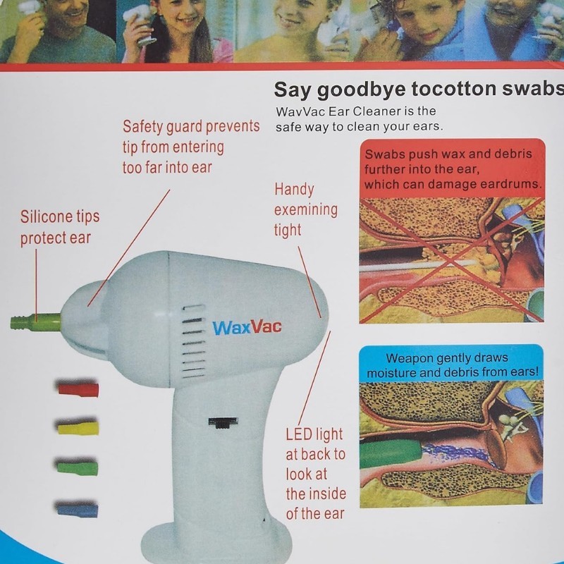 The WaxVac Ear Cleaner provides a safe and gentle way to clean your ears. Its silicone tips protect your ears while the device gently removes moisture and debris. Equipped with a safety guard to prevent deep insertion and an LED light for visibility, it's a perfect alternative to dangerous cotton swabs.