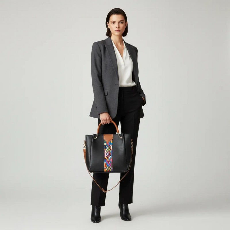 Elevate your style with this elegant black handbag, designed for both functionality and fashion. Crafted from high-quality materials, its sleek black exterior is beautifully contrasted by a vibrant, multicolored strap, making it a standout accessory. The spacious interior offers ample room for your essentials, while the adjustable shoulder strap ensures comfort and versatility. Perfect for any occasion, this handbag effortlessly combines practicality with chic design.