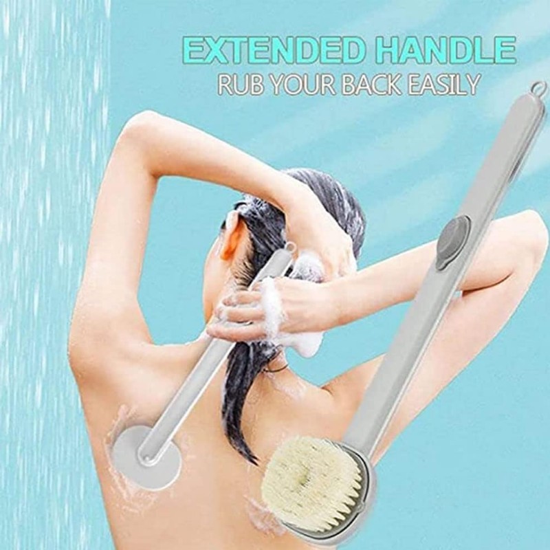 A versatile bath brush with a long handle for easy reach, perfect for exfoliating and cleansing.