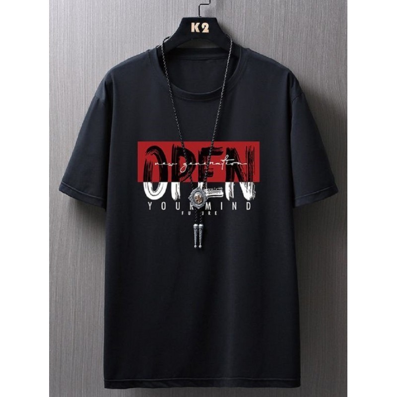 The predominantly black design serves as a versatile canvas for its striking graphic elements. Featuring the bold word "OPEN" in large white letters against a vibrant red background, this T-shirt captures attention effortlessly. The additional phrases "YOUR MIND" and "FUTURE" complement the main graphic, creating an eye-catching visual that resonates with modern urban culture.