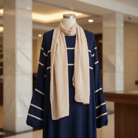 Robe Rayée Marine Élégante avec Écharpe Beige
