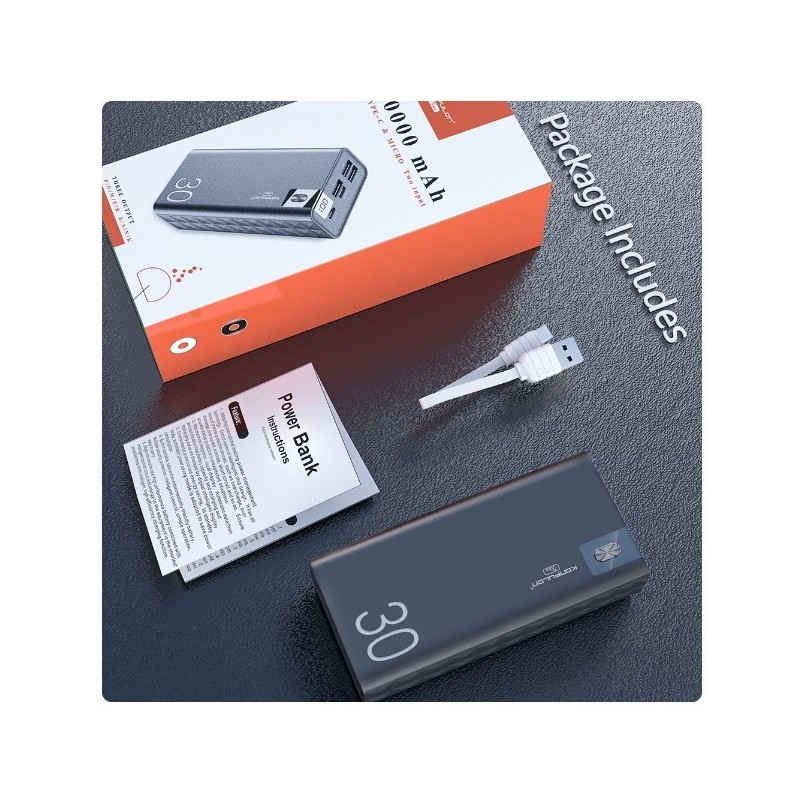 Découvrez la Batterie externe 30000mAh 18W, un chargeur de grande capacité conçu pour répondre à tous vos besoins de recharge en déplacement. Avec sa capacité impressionnante de 30,000mAh, cette batterie externe vous permet de recharger plusieurs appareils électroniques tels que smartphones, tablettes et ordinateurs portables sans effort. Ce chargeur portable est équipé d'un écran LCD qui affiche le niveau de charge restant, vous offrant une visibilité claire sur l'énergie disponible. Grâce à sa puissance de sortie allant jusqu'à 18W, il garantit un chargement rapide et efficace pour tous vos appareils compatibles. Avec son design compact et léger, la Batterie externe 30000mAh se glisse facilement dans votre sac ou votre poche. Sa construction robuste en plastique durable assure une protection optimale tout en restant esthétique avec sa finition noire mate élégante. De plus, les ports USB multiples permettent une recharge simultanée de plusieurs dispositifs. Cet accessoire est idéal pour les voyageurs fréquents ou ceux qui passent beaucoup de temps à l'extérieur. Ne laissez pas la faible autonomie des batteries vous freiner ; optez pour ce batterie externe auxiliaire portable, qui combine performance et praticité. Batterie externe 30000mAh 18W, chargeur puissant avec écran LCD : c'est l'outil indispensable pour garder vos appareils chargés où que vous soyez. Que ce soit lors d'un voyage d'affaires ou d'une aventure en plein air, faites confiance à cette solution fiable pour rester connecté tout au long de la journée.