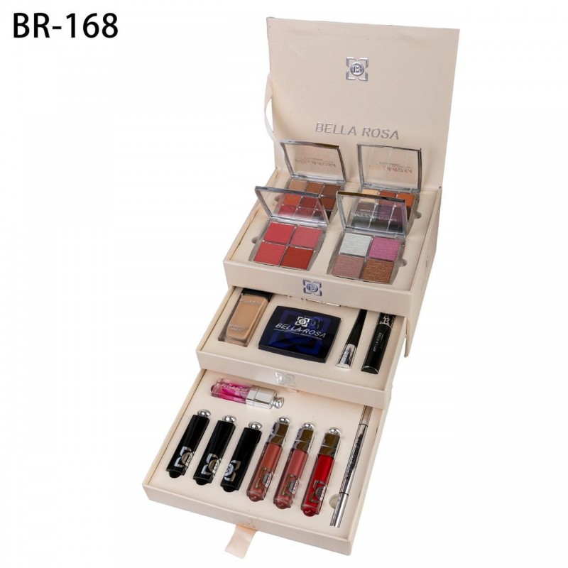 Découvrez l'élégance de la collection de cosmétiques Bella Rosa BR-168. Cet ensemble sophistiqué comprend un étui de couleur crème avec plusieurs compartiments, abritant une gamme d'essentiels de maquillage, y compris des couleurs à lèvres, des fards à paupières et un fond de teint compact. Parfait pour les passionnés de maquillage, il offre polyvalence pour toute occasion tout en garantissant un transport et une organisation faciles.