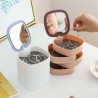 Le conteneur de gauche arbore une finition blanche élégante, caractérisée par ses bords arrondis et son design compact, ce qui en fait un ajout idéal à toute table. Sa construction en plastique durable garantit une longévité, tandis que le miroir carré attaché avec des coins arrondis offre un moyen pratique de vérifier votre look avant de sortir. À l'intérieur, la doublure en tissu sombre et doux protège vos précieux objets des rayures, garantissant qu'ils restent en parfait état.