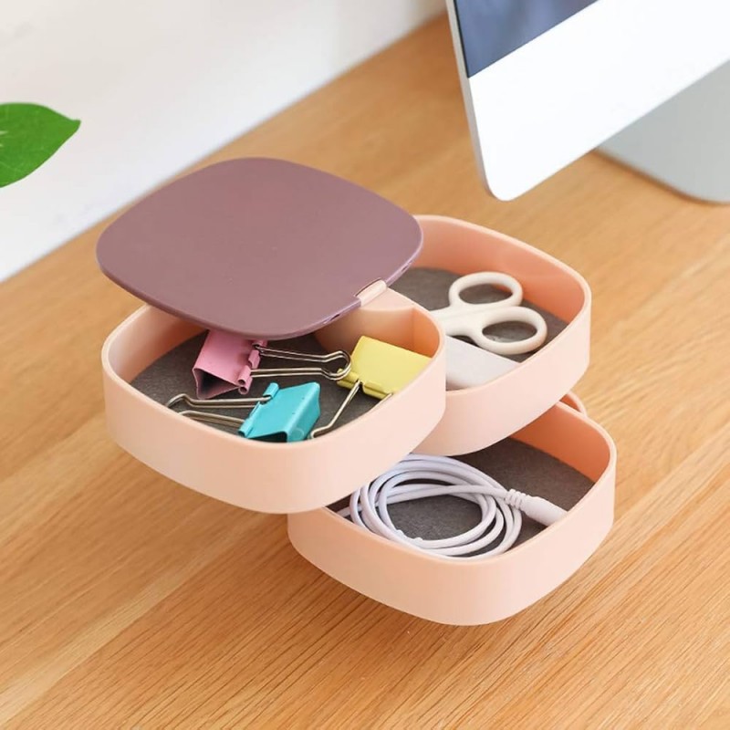 D'autre part, le conteneur de droite, disponible dans une teinte pêche douce ou rose clair, présente une structure en étagères qui non seulement améliore son attrait esthétique mais maximise également la capacité de stockage. Le design ouvert permet un accès facile aux bagues, bracelets et boucles d'oreilles rangés dans ses compartiments visibles. Fabriqué à partir d'un plastique de haute qualité similaire avec une finition mate, cet organisateur complète sans effort tout décor moderne.