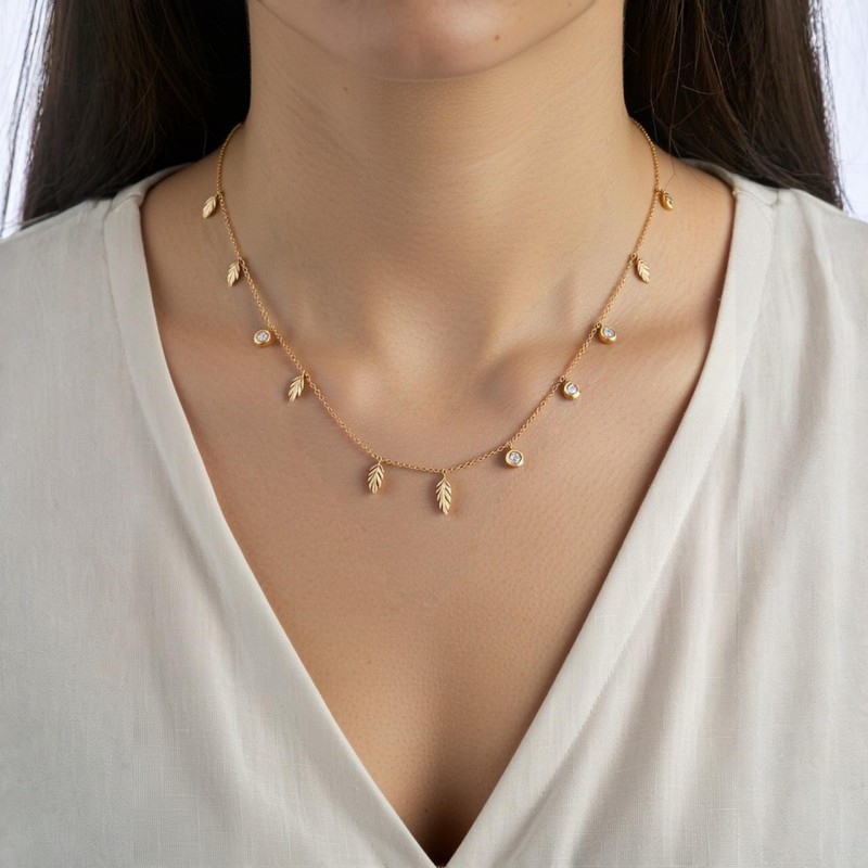 Ornez-vous de ce magnifique collier en or avec de délicats pendentifs en forme de feuille, parfait pour toute occasion.
