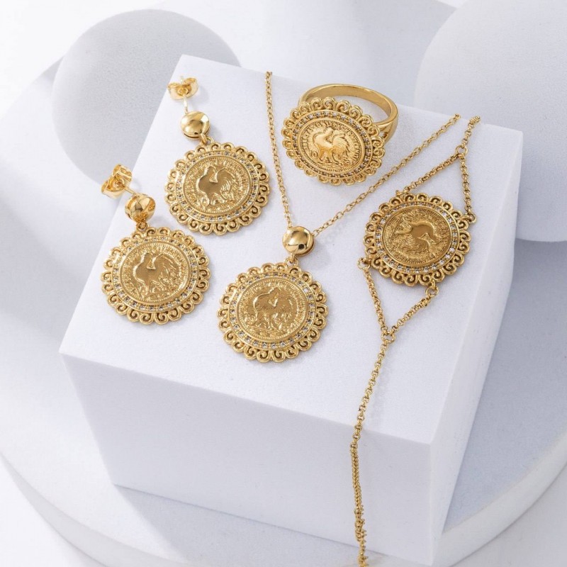 Cet ensemble de bijoux plaqué or éblouissant est un parfait mélange d'élégance et de sophistication. Chaque pièce met en valeur des designs de pièces de monnaie intricats, ajoutant une touche de charme vintage à votre tenue. L'ensemble comprend un collier, une paire de boucles d'oreilles, un bracelet et une bague, tous soigneusement conçus pour rehausser votre style. Idéal pour un usage quotidien et des occasions spéciales, cet ensemble est un incontournable de toute collection de bijoux.