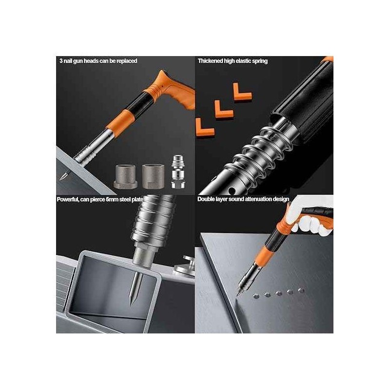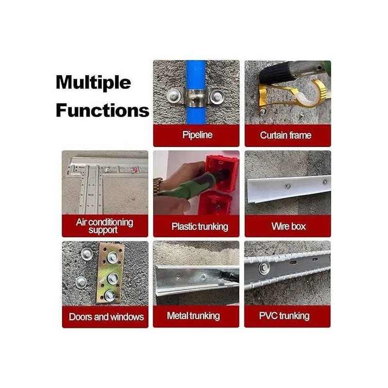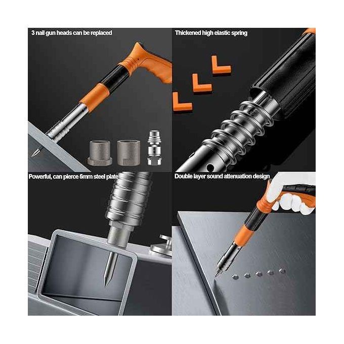 exigences multiples, largement utilisées:le pistolet à clous répond à diverses exigences techniques et est largement utilisé pour l'installation et la fixation de fenêtres antivol, de moniteurs, de boîtes à instruments, de cadres de climatisation, de conduites d'eau et de conduits de ventilation, etc. la conception de la réduction du bruit et de l'atténuation du bruit rend l'environnement de construction plus confortable et ne perturbe pas les gens. ressorts en acier au carbone à haute résistance : nos pistolets à clous de plafond adoptent des ressorts de qualité industrielle. Après trois traitements thermiques à haute température, la structure du ressort est plus robuste et durable que les ressorts ordinaires. Excitation stable, rejet des ratés, haute élasticité et fort impact. Forte puissance, facile à briser le bois, les tôles d'acier, les tuiles, le béton, etc.facile à utiliser:notre pistolet à clous manuel en acier est petit et léger, avec une longueur totale de seulement 13 pouces (33 cm), un design petit et léger, seulement 1,2 LB (550 g). L'opération à une main est simple, il suffit de pousser et de desserrer, 1 seconde peut tirer le clou. Pas besoin d'électricité.   Nom: Mini Rivet Outil Ensemble Matériel: Métal, Caoutchouc Gamme d'application: plafond d'outillage, ligne fixation de tuyau, installation électrique de boîte, climatisation, installation de conduit de ventilation, etc. Couleur: Comme indiqué