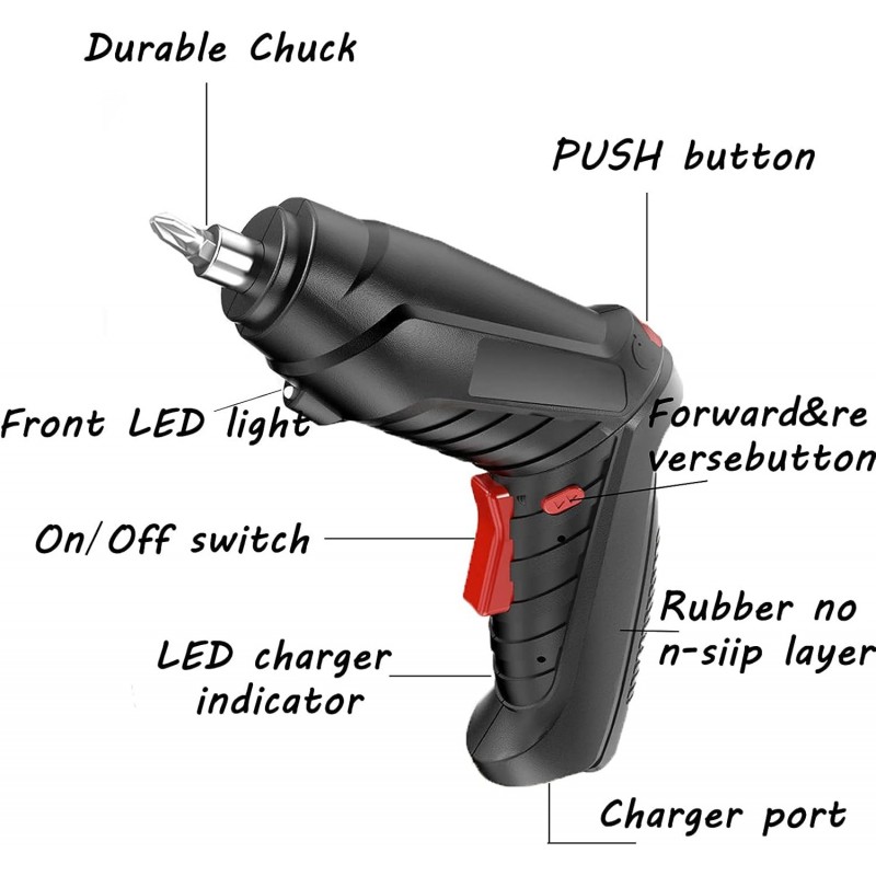 Découvrez le Tournevis électrique 47 en 1, un outil indispensable pour tous vos projets de bricolage. Conçu avec une forme ergonomique et compacte, ce tournevis offre une prise en main confortable, facilitant son utilisation dans des espaces restreints. Sa couleur noire élégante, accentuée par des touches de rouge, lui confère un aspect moderne et fonctionnel. Fabriqué à partir de plastique durable, le corps du tournevis est léger tout en étant résistant à l'usure. La poignée est dotée d'une couche en caoutchouc antidérapante qui assure une prise sécurisée pendant l'utilisation. Grâce à son mandrin durable, vous pouvez changer rapidement les embouts pour s'adapter à différents types de vis. L'un des atouts majeurs du Tournevis électrique 47 en 1 est sa puissance : avec un couple maximal de 3,5 N·m, il convient parfaitement aux tâches légères comme l'assemblage ou les réparations domestiques. De plus, il intègre une lumière LED frontale qui éclaire votre zone de travail dans des conditions peu lumineuses. Cet outil sans fil fonctionne grâce à sa batterie Li-ion rechargeable de 3,6 V. Le port de charge est facilement accessible et un indicateur LED vous permet de suivre l'état de la batterie pour ne jamais être pris au dépourvu lors d'un projet urgent. Le Tournevis électrique 47 en 1 se distingue par ses fonctionnalités pratiques telles que le bouton marche/arrêt et le bouton avant/arrière pour passer aisément entre visser et dévisser. Que vous soyez professionnel ou amateur passionné par le bricolage, cet outil polyvalent répondra à tous vos besoins d'assemblage et d'entretien.