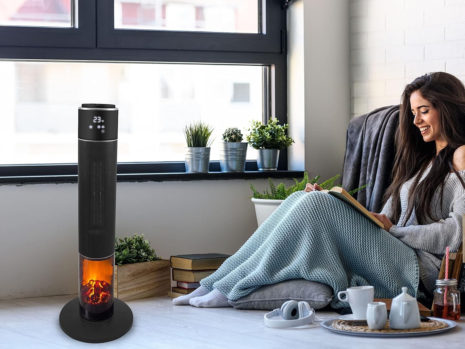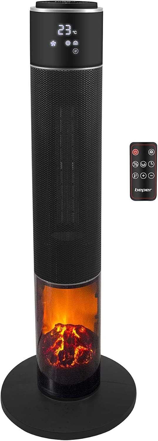 Elégant thermoventilateur à tourelle, avec éléments chauffants céramiques au puissant effet calorifique et aux faibles consommations. Equipé d’un panneau de contrôle tactile avec télécommande et minuterie programmable jusqu’à 8 heures. Lumière LED avec effet flamme, pour donner une atmosphère chaleureuse et accueillante à chaque chambre. Thermostat réglable et fonction ventilation, oscillation horizontale automatique et affichage LED.