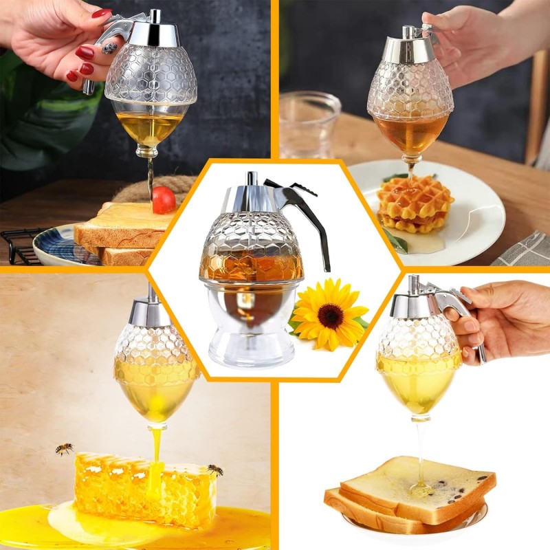 Découvrez le Honey Pot, un distributeur de miel en conteneur vintage conçu pour une distribution de sirop sans effort. Sa belle forme en alvéole ajoute du charme à votre cuisine tandis que la fonction anti-goutte garantit un versement sans désordre. Fabriqué en verre durable avec un bec métallique élégant, ce distributeur de sirop pour la maison allie fonctionnalité et style, le rendant parfait pour servir du miel ou des sirops lors de tout rassemblement.