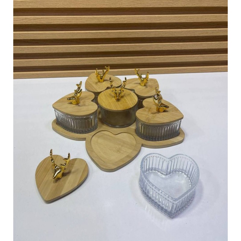 Élevez votre expérience culinaire avec cet ensemble de service décoratif sur le thème du cœur. Fabriqué en verre ou en acrylique transparent avec des textures nervurées et des couvercles en bambou naturel, il présente de charmants accents de cerfs dorés. Parfait pour servir des collations ou comme pièce maîtresse époustouflante, cet ensemble polyvalent allie charme rustique et élégance moderne, le rendant idéal pour des occasions romantiques et des célébrations.