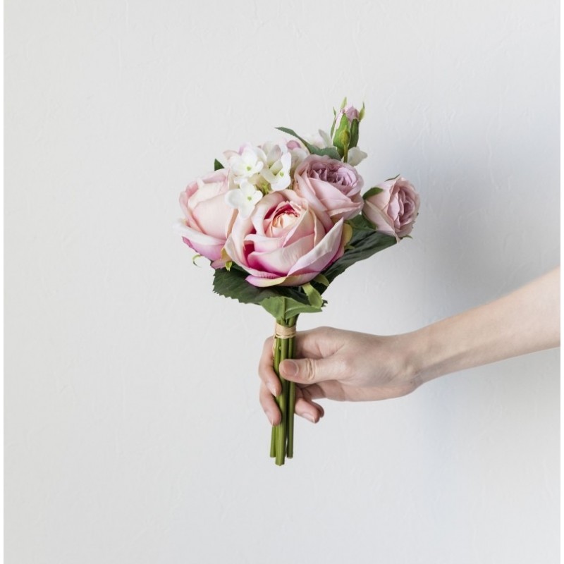 Découvrez la beauté enchanteresse de notre bouquet floral, un arrangement époustouflant parfait pour toute occasion. Ce bouquet exquis présente de luxuriantes roses dans des teintes de rose doux, passant gracieusement au blanc sur les bords, créant un effet visuel captivant. Les pétales étroitement superposés de ces roses offrent une apparence volumineuse qui ne manquera pas d'impressionner. Complétant les roses, de délicates fleurs blanches servent de charmantes fleurs de remplissage, améliorant l'esthétique globale de cet arrangement délicieux. L'ajout de feuilles vertes vibrantes offre un contraste naturel, apportant vie et fraîcheur à votre présentation florale. Ce bouquet est conçu pour la polyvalence, sa taille compacte permet de le tenir facilement d'une main, ce qui le rend idéal pour divers contextes. Que vous ayez besoin d'un bouquet de mariée époustouflant, d'un centre de table élégant pour votre prochain événement, ou que vous souhaitiez simplement surprendre quelqu'un de spécial avec un cadeau attentionné, cet arrangement s'intègre parfaitement à la fois dans des occasions formelles et décontractées. La palette de couleurs pastel douce—principalement rose clair accentuée de blanc et de vert—exhale romance et élégance. Chaque rose arbore une forme arrondie tandis que les fleurs de remplissage ajoutent une texture aérienne qui renforce la douceur globale du bouquet. Cette composition magnifiquement arrangée ne sert pas seulement de décoration accrocheuse mais incarne également un attrait intemporel adapté aux mariages ou à tout événement festif. Élevez votre espace ou votre expérience de cadeau avec notre bouquet floral—un véritable témoignage de la beauté de la nature qui laissera des impressions durables sur tous ceux qui le rencontrent.