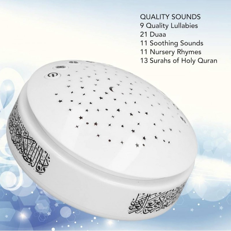 Transformez votre espace avec notre lampe de projection d'étoiles, conçue pour l'ambiance et la détente. Cette lampe en forme de dôme compacte présente une finition blanche élégante et une calligraphie arabe complexe. Profitez de plusieurs modes d'éclairage et de sons apaisants, parfaits pour les chambres d'enfants ou les espaces de méditation. Créez une atmosphère apaisante qui améliore votre décoration intérieure tout en favorisant un sommeil réparateur.