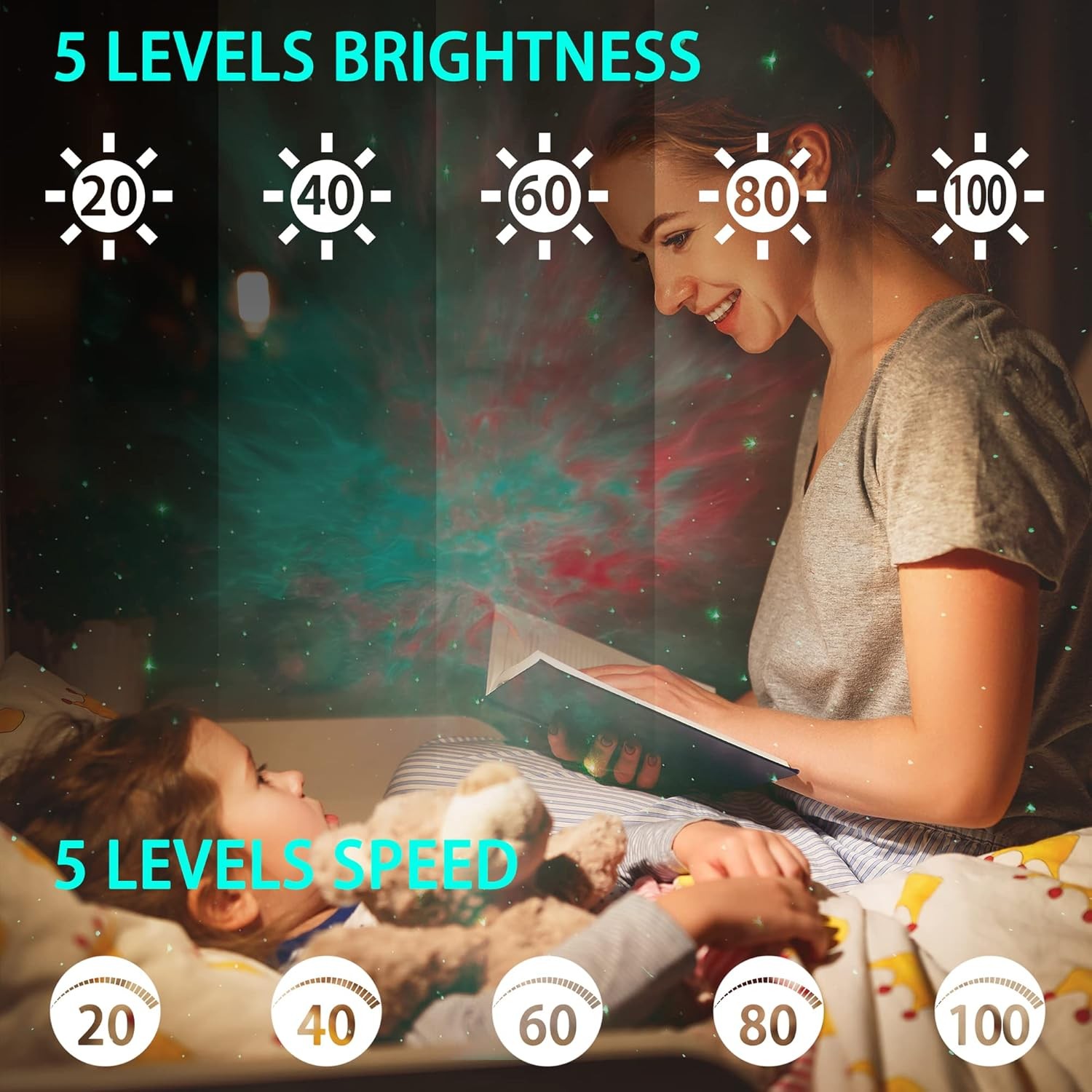 3.Two Timing Modes: 45 min, 90 min. The star light projector for bedroom features an automatic off timer which you can set at either 45 or 90 minutes with either your remote control or by a press of a button on the projector. The star night light projector will automatically turn off after you fall asleep under a starry sky.