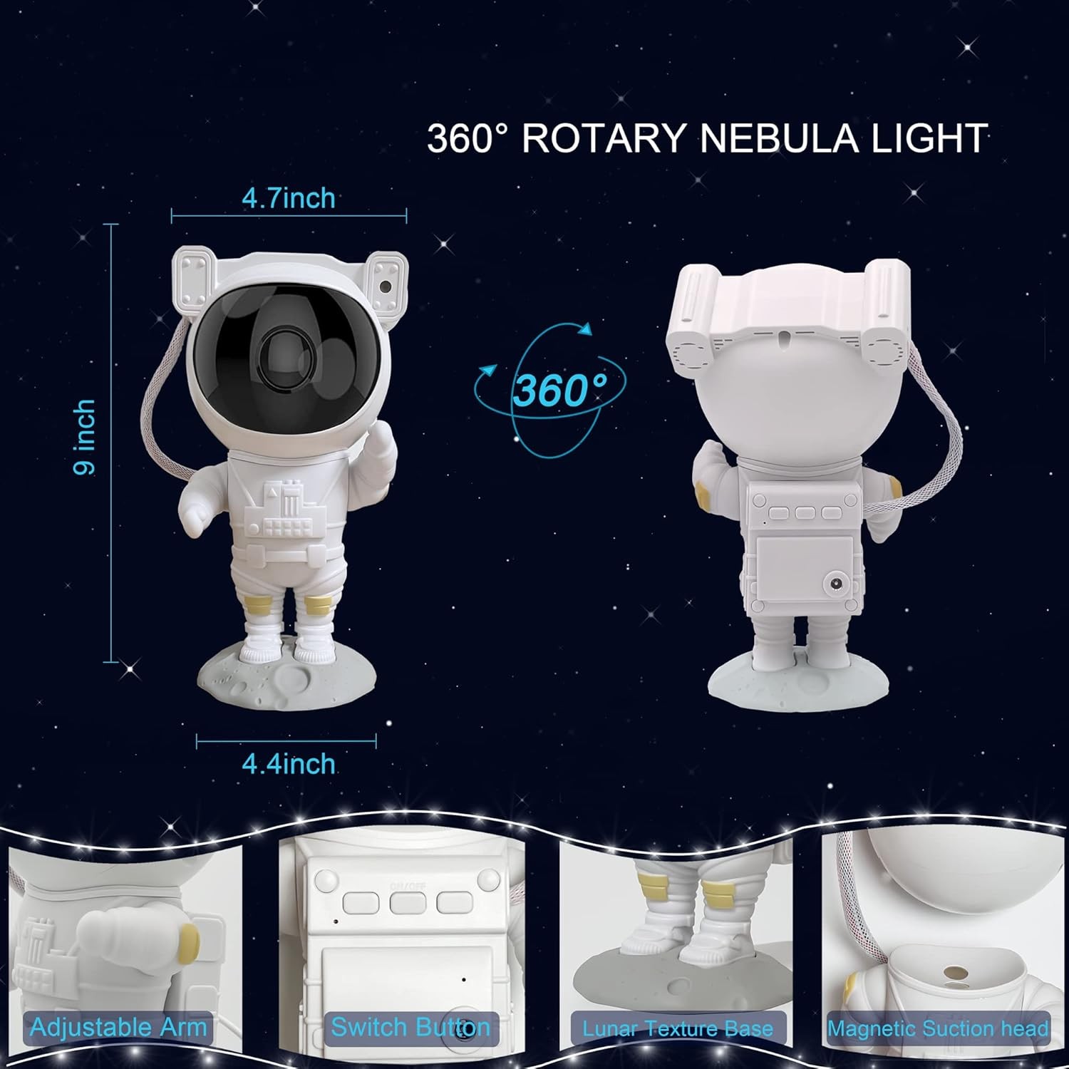 4.Adjustable Projection Angle. The astronaut’s head, which can be rotated 360° with magnetic attraction, allows the nebula to be projected anywhere without restriction. In addition, the astronaut’s the arms can be moved, and various poses can be taken, which is also a good decorative ornament.
