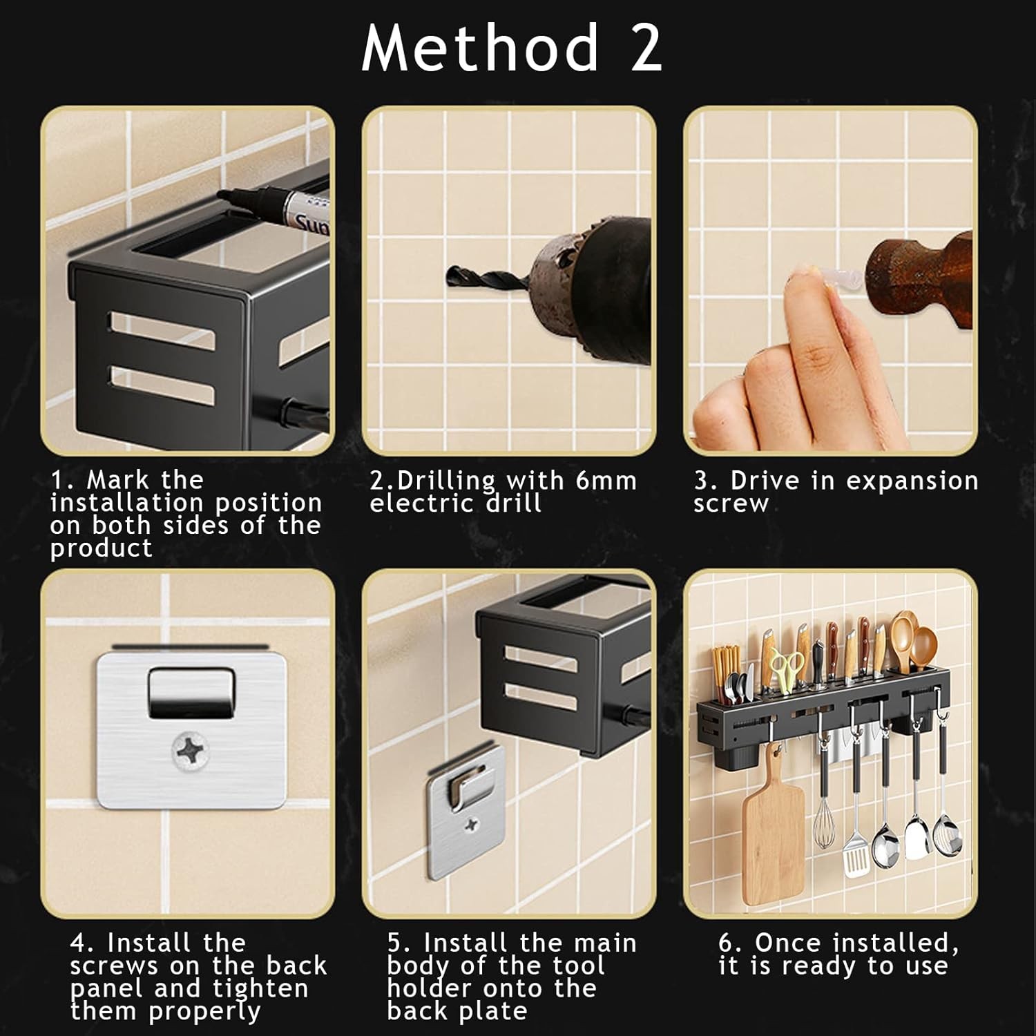 Perçage et installation : 1. Marquer la position d'installation sur les deux côtés du produit ; 2. percer des trous à l'aide d'une perceuse électrique de 6mmd ; 3. enfoncer les vis d'expansion ; 4. fixer la plaque arrière avec des vis et la visser ; 5. installer le thème du porte-couteau sur la plaque arrière ; 6. l'installation est terminée et prête à l'emploi.