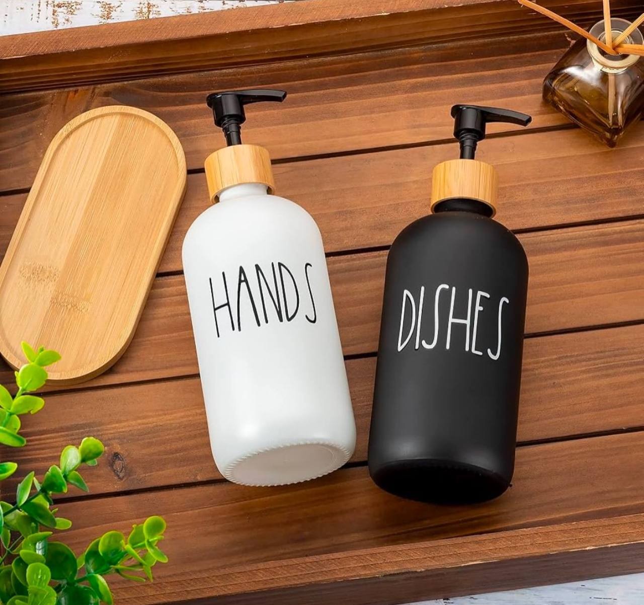 Élevez votre espace avec notre ensemble élégant de deux distributeurs de savon, conçus pour le lavage des mains. Avec une finition blanche givrée et noire brillante, ces distributeurs ajoutent une touche moderne à toute salle de bain ou cuisine. L'étiquette ludique "HANDS" et les bouchons en bois naturel rehaussent leur attrait esthétique tout en garantissant un dosage facile de savon liquide ou de lotion.